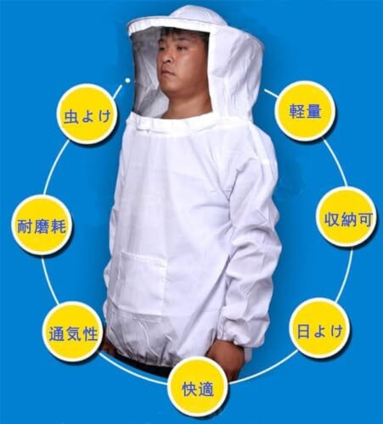 上半身丸ごとかぶるので、養蜂やガーデニングの作業など虫刺されるのに効果的に防止するためのミツバチ服です。外での作業のお助けアイテムです!