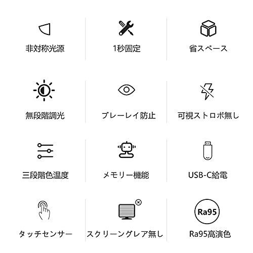 【無段階調光調色】モニタ掛け式ライトには調光機能・調色機能は搭載されています。太陽光にもっとも近い光品質で、目にとって最適に調整が可能なので、あらゆるシーンで快適に使用できます。メモリー機能も搭載しているため、電源OFF前の色温度と明るさを記憶し、次の点灯時に記憶したモードで点灯します。