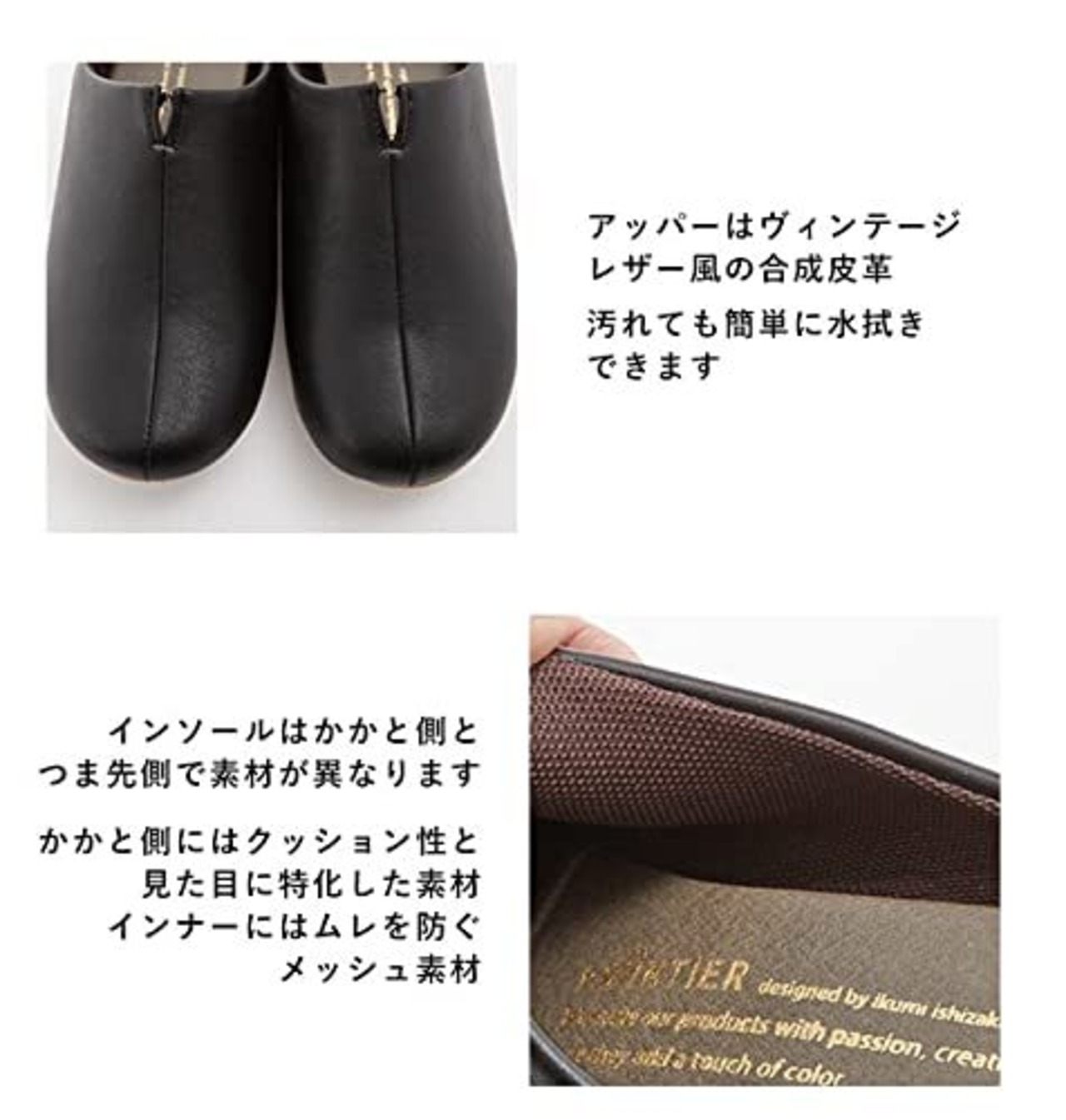 素材:甲バンド(合成皮革)、底材(合成繊維)、滑り止め(ポリ塩化ビニル)/ 生産国:中国