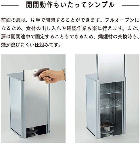 ●前面の扉は片手で開閉可能。フルオープンで操作できるので、食材の出し入れもラクラク。扉は途中で固定もでき、燻煙材の交換も煙が外に逃げにくい。