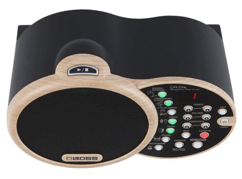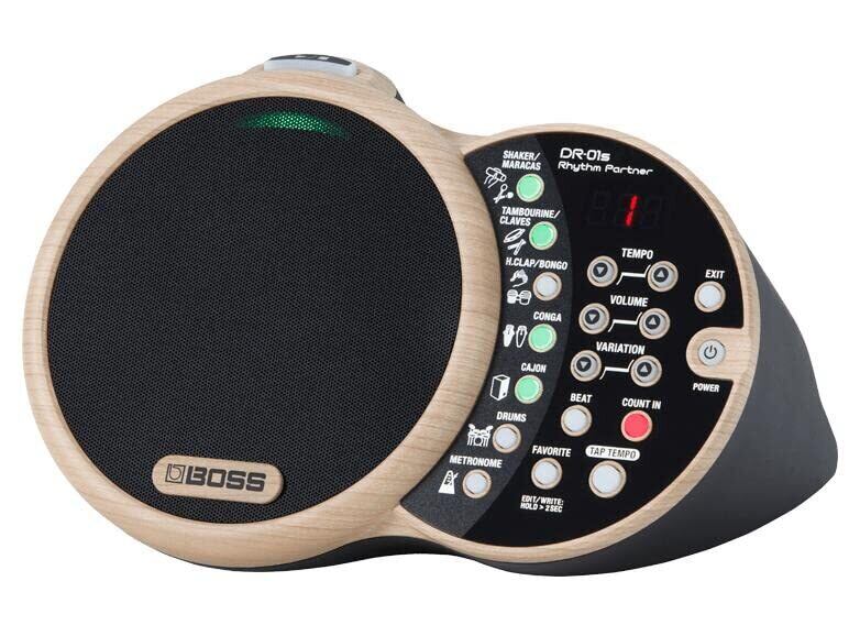 DR-01S Rhythm Partnerは、アコースティック・ギターなどのアンプラグド楽器を楽しむミュージシャンのためにデザインされたリズム・パートナーです。リズム・パターンをプログラミングすることなく、曲のイメージや気分に合わせて、ボンゴやコンガ、タンバリンといったパーカッションを選び、サウンドを重ねていくだけで簡単にリズムを再生。収録されたリズム・パターンはシンプルで汎用性が高くジャンルを選ばないため、アコースティック・ギターやボーカルをはじめ、ウクレレ、ピアノなど様々なアコースティック楽器とのセッションが楽しめます。カスタム・スピーカーや乾電池駆動をはじめ、小型アンプ設計のノウハウがコンパクトなボディに凝縮されており、高音質かつサイズを超えた音量で、いつでもどこでもアコースティック楽器を演奏する際のリズムをサポートします。