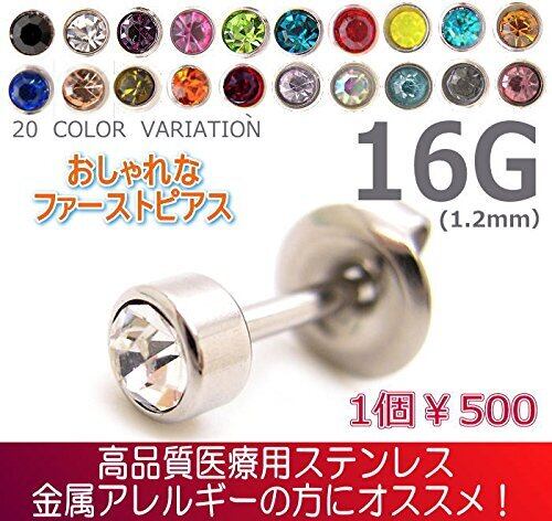材質:サージカルステンレス316L、グラスストーン サイズ:16G(約1.2mm)一般的な耳用ピアッサーの太さです。ヘッドの直径4mm、ヘッド部分からキャッチまでの間は6mm、針全体の長さは10mm
