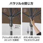 ※雨や強風時は必ず閉じてください。パラソルはパラソルベースとテーブルの2点支持でご使用ください。パラソルの直立が非常に不安定となります。風の影響を受けやすいため風向きをご確認ください。
