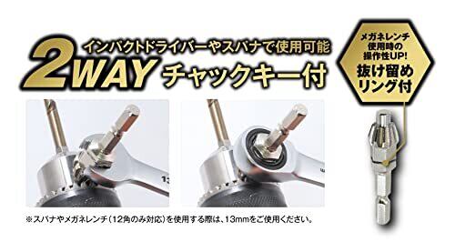 ■インパクトレンチに簡単に取り付け可能なQC仕様です。インパクトドライバーやスパナ、メガネレンチでも着脱可能なチャックキー付です。