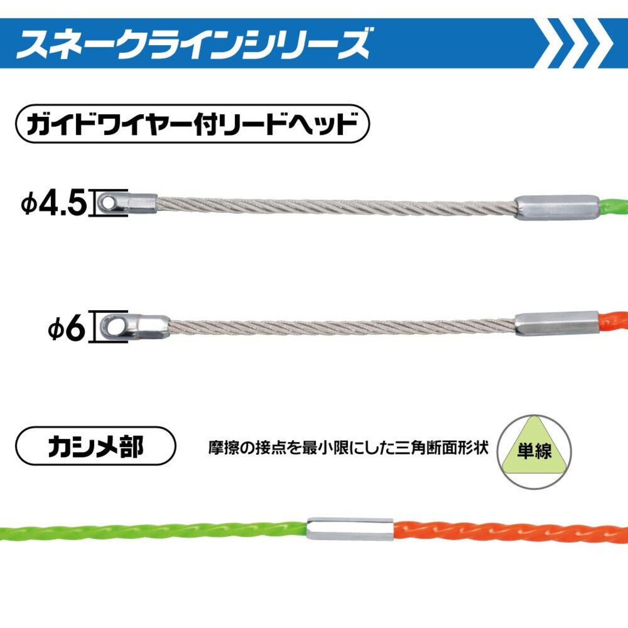 細い線直径3mm 10m(グリーン)で案内し、太い線直径4.5mm 30m(オレンジ)で押し込む。狭いスキ間、追加配線に威力を発揮。究極のよび線。