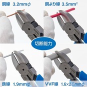 切断能力は銅線3.2mmφ、銅より線3.5mm^2、鉄線1.9mmφ、VVF線:1.6mmφ×2芯。