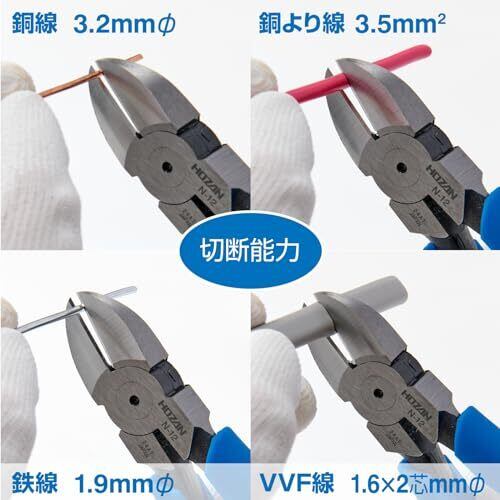 【切断能力】銅線:3.2mmφ、銅より線:3.5mm^2、鉄線1.9mmφ、VVF線:1.6mmφ×2芯【硬度HRC】刃部:60【重量】160g【全長】163mm【用途】銅線・鉄線・VVF線の切断、電線の切断や被覆剥離、電気工事、配線工事、電子工作、プラモデル・模型・アクセサリーの製作、ワイヤーワーク