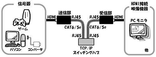 機器は送信側と受信側に分かれます。送信側でハイビジョン信号をHDMI端子で受け、TCP/IPに変換しLANケーブルで長距離配線、受信側でTCP/IPからHDMIに戻し出力します。