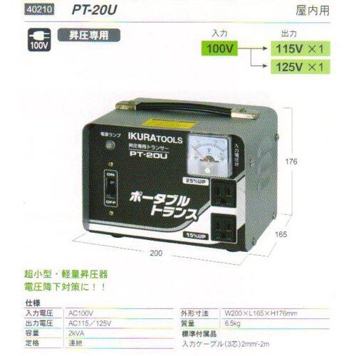 育良精機 ポータブルトランス PT20U 昇圧専用 AC100V