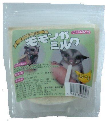 モモンガ、リスのベビーに与える粉ミルクです。 バナナ風味で食いつき抜群です。 モモンガミルク1に対して1.5倍のお湯で溶かして与えます。 ドライフードをこのミルクでふやかすと効果的。 少し大きい子には粉のままエサにふりかけても良いです。