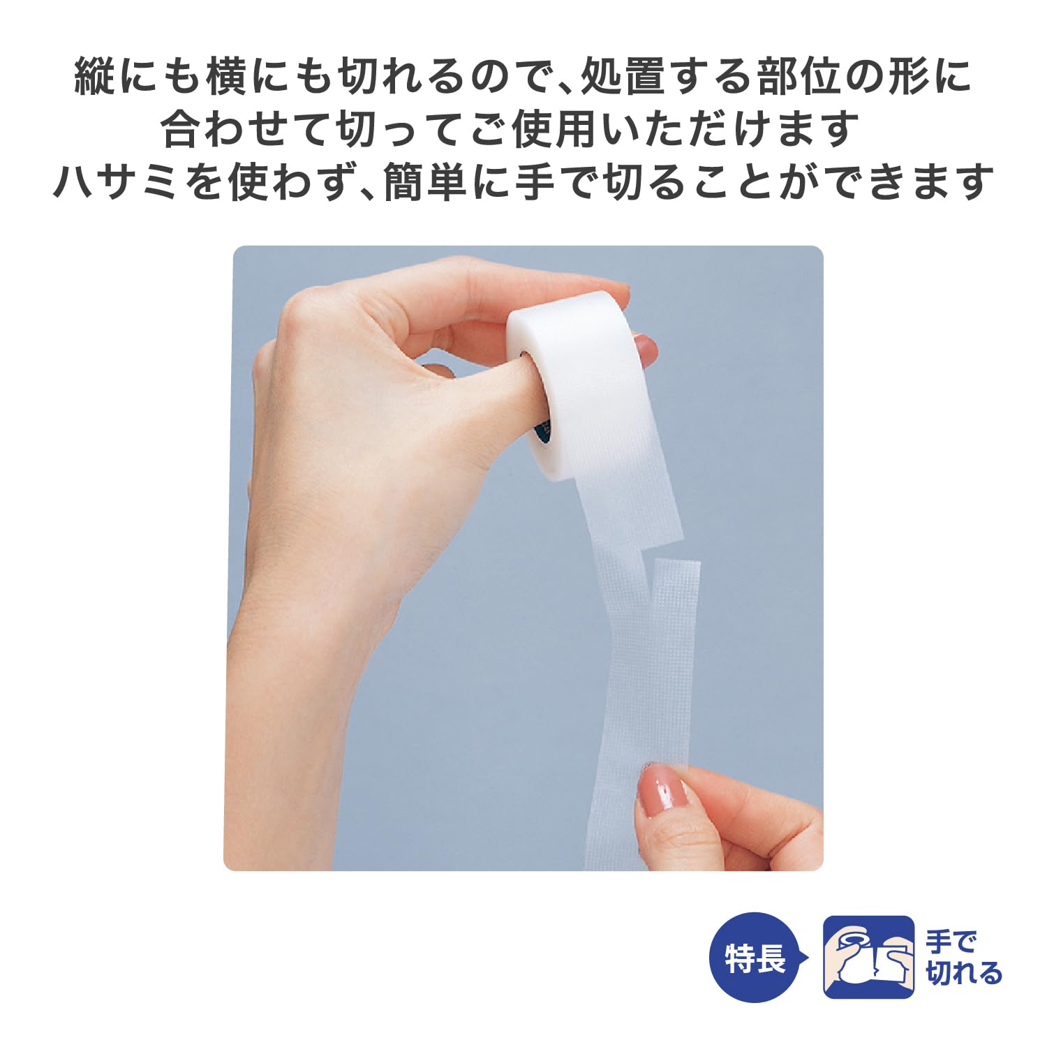 【ガーゼや包帯、チューブなどの固定に】縦にも横にも切れるので、処置する部位の形に合わせて切ってご使用いただけます。