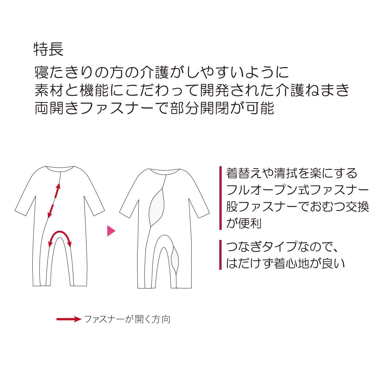 ●寝たきりの方を介護がしやすいよう素材と機能にこだわって開発された介護ねまきです●カテゴリー:衣類・寝具用品●用途:介護ねまき●胃ろう用・尿管用カテーテルなどをつけたままでも介護のしやすい両開きファスナーを採用。●フルオープン式のファスナーや股ファスナーを前面に配置することにより、着替えや清拭・おむつ交換がしやすくなります。●背面に縫い目やつぎ目がないので、床ずれの原因となる肌への刺激が軽減されます。●生地は各タイプともソフトな肌ざわりの素材を使用しています。