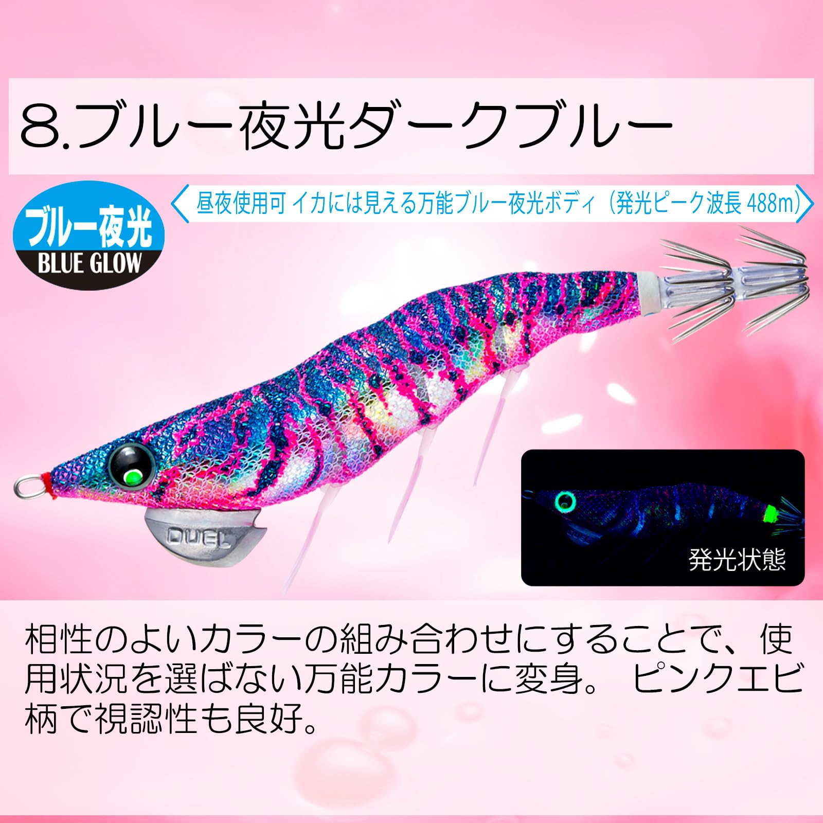EZ-Qシリーズ史上、最強アピールの色と柄!! ●軽快ダートはそのままに「波動」「色」「音」で高活性のイカに、トリプルアピール!●色:全20色の色がスゴイ!!●音:アピール抜群のエビ音搭載!!●波動:パタパタフットライトの釣れる波動でアピール!!