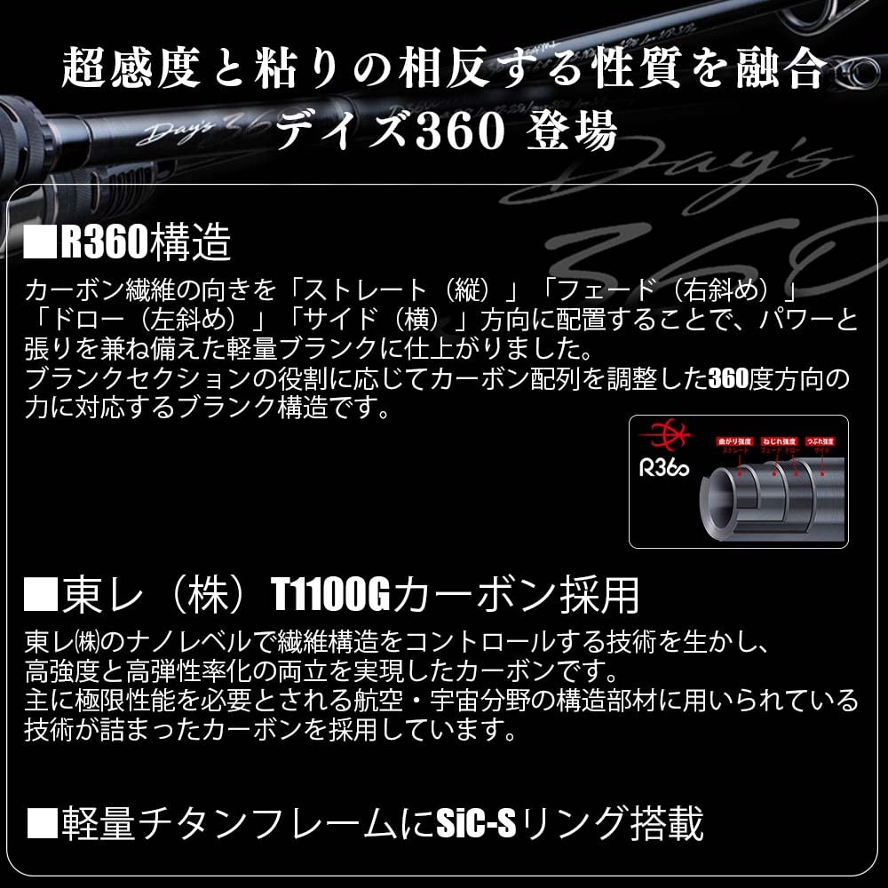 最新素材と最新技術で異次元のバスロッドが登場。 数々のビッグバスや超タフコンディションで実績を叩 き出したデイズ360。 アングラーの技量を問わないセミオートマティックな ブランクは、オートマティックかつテクニックを生かし たマニュアル操作でも高次元にアングラーに応えて くれるでしょう。