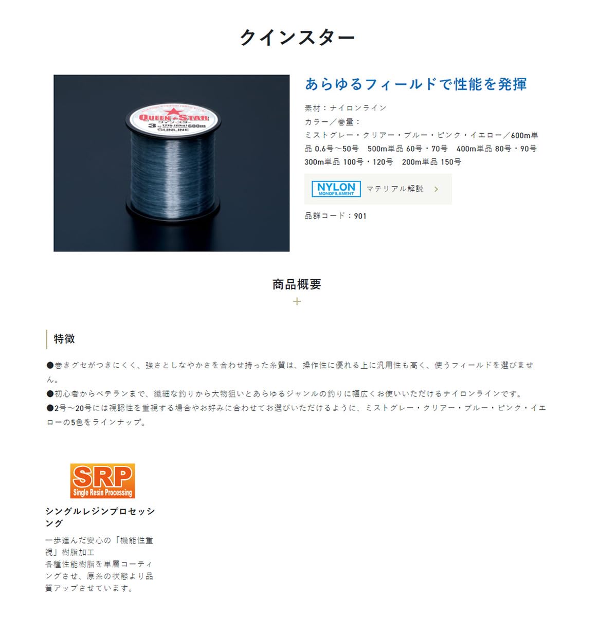 ●巻きグセがつきにくく、強さとしなやかさを合わせ持った糸質は、操作性に優れる上に汎用性も高く、使うフィールドを選びません。 ●初心者からベテランまで、繊細な釣りから大物狙いとあらゆるジャンルの釣りに幅広くお使いいただけるナイロンラインです。 ●2号〜20号には視認性を重視する場合やお好みに合わせてお選びいただけるように、ミストグレー・クリアー・ブルー・ピンク・イエローの5色をラインナップ。