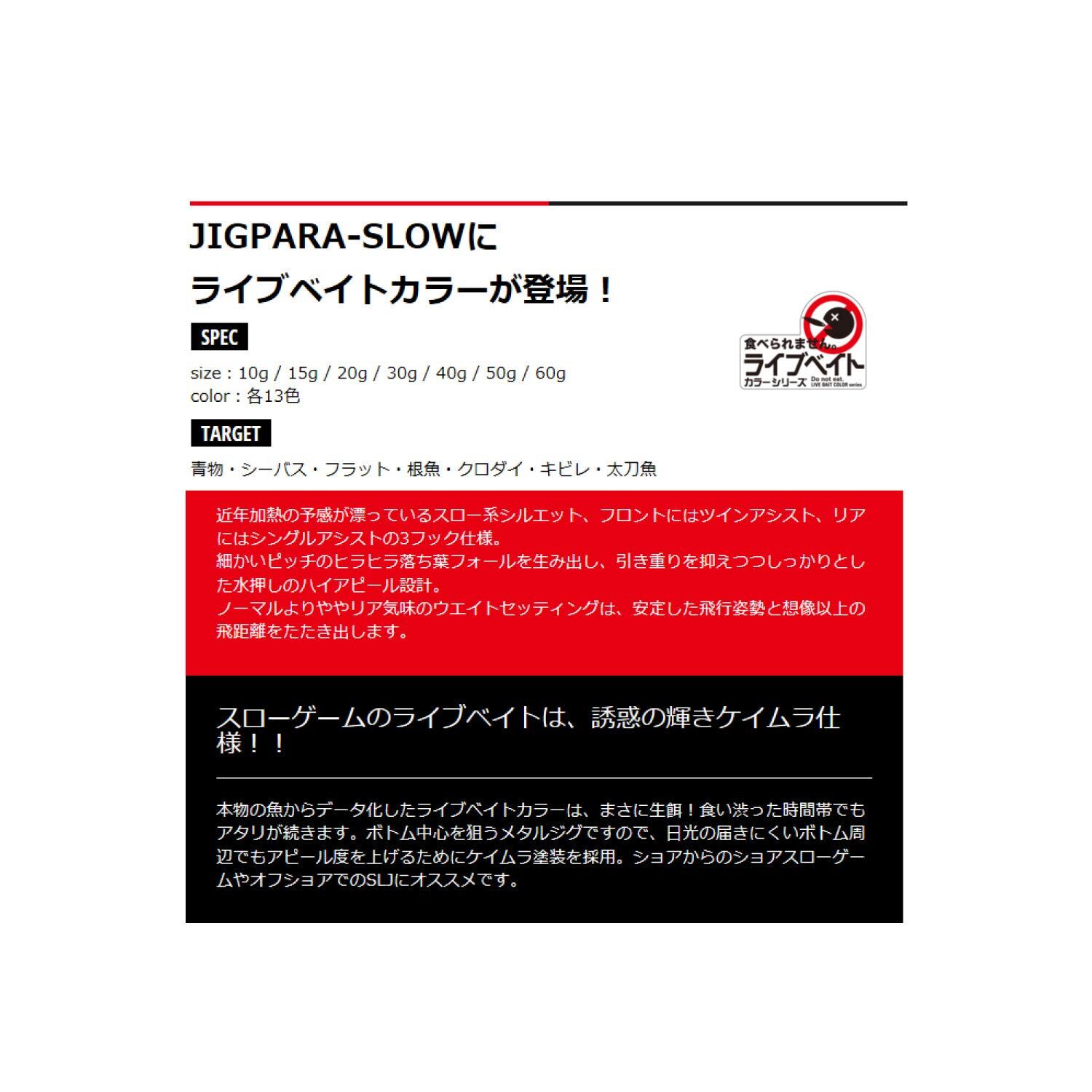 ボトムに潜む根魚や真鯛に圧倒的実勢のあるジグパラスローにライブベイトカラーが登場です。本物の魚からデータ化したライブベイトカラーは、まさに生餌!喰い渋った時間帯でもアタリが続きます。ジグパラスローはボトム中心を狙うメタルジグですので、日光の届きにくいボトム周辺でもアピール度を上げるためにケイムラ塗装を採用。広範囲にアピールし魚を引く付け、思わず口を使いそうなリアルジグでスレた魚もイチコロでしょう。ショアからのショアスローゲームやオフショアでのスーパーライトジギングSLJにオススメです。