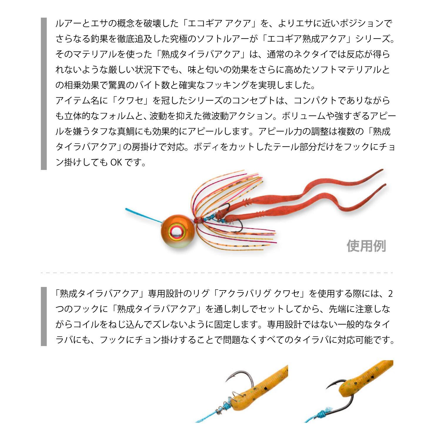 ルアーとエサの概念を破壊した「エコギア アクア」を、よりエサに近いポジションでさらなる釣果を徹底追及した究極のソフトルアーが「エコギア熟成アクア」シリーズ。そのマテリアルを使った「熟成タイラバアクア」は、通常のネクタイでは反応が得られないような厳しい状況下でも、味と匂いの効果をさらに高めたソフトマテリアルとの相乗効果で驚異のバイト数と確実なフッキングを実現しました。 「熟成タイラバアクア クワセカーリースリム」は、細めのロングカーリーテールが生む変幻自在のアクションにより、微波動ながらもしっかりアピール。低速から高速まで安定したアクションに仕上がっています。