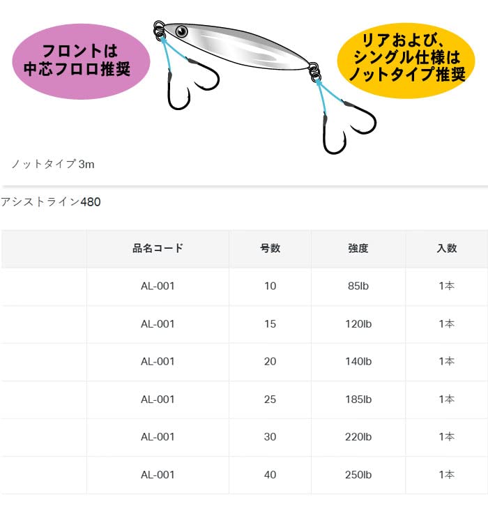 がまかつアシストライン480 ノットタイプ 3m◆入数:1本水中でアピールすることをコンセプトに設計されたオリジナルアシストライン!水中で色が通りやすいと言われる可視光線480nm付近にカラーチューニングを施したアシストライン。ジグ本体と同じように、アシストラインもシルエットの一部としてターゲットにより強くアピールすることで、魚の反応距離を伸ばすことが可能。すなわち、より遠くの魚にアピールすることが可能となる、全く新しいコンセプトからデザインされたアシストラインです。中芯フロロ入り、ノットタイプの2パターンで様々なアシストフック作成が可能です。