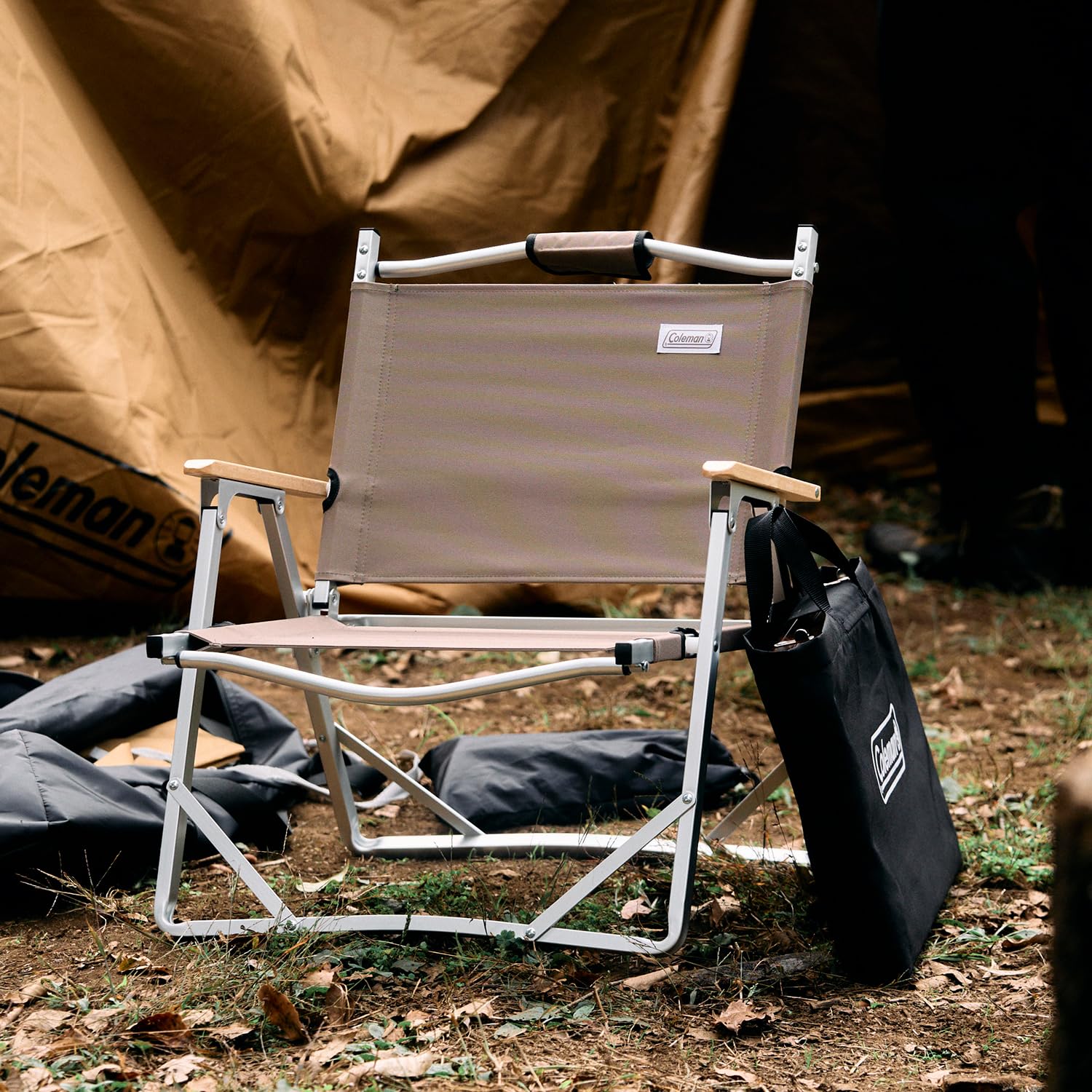 【キャンプ用椅子】燃えにくい生地で焚火シーンに適した座り心地のいいロースタイルチェア。肌触りの良いウッドアームレスト。
