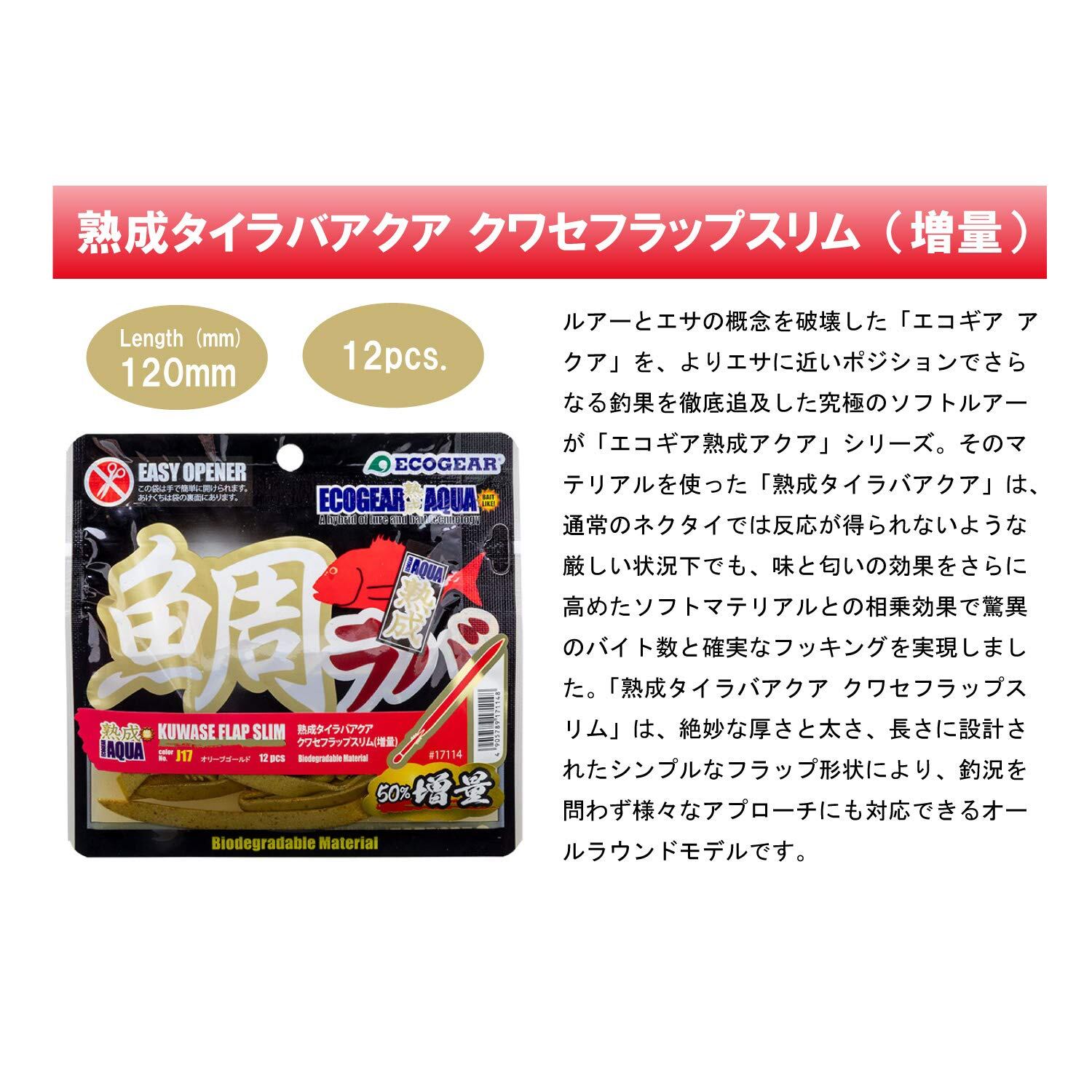 ルアーとエサの概念を破壊した「エコギア アクア」を、よりエサに近いポジションでさらなる釣果を徹底追及した究極のソフトルアーが「エコギア熟成アクア」シリーズ。そのマテリアルを使った「熟成タイラバアクア」は、通常のネクタイでは反応が得られないような厳しい状況下でも、味と匂いの効果をさらに高めたソフトマテリアルとの相乗効果で驚異のバイト数と確実なフッキングを実現しました。 「熟成タイラバアクア クワセフラップスリム」は、絶妙な厚さと太さ、長さに設計されたシンプルなフラップ形状により、釣況を問わず様々なアプローチにも対応できるオールラウンドモデルです。