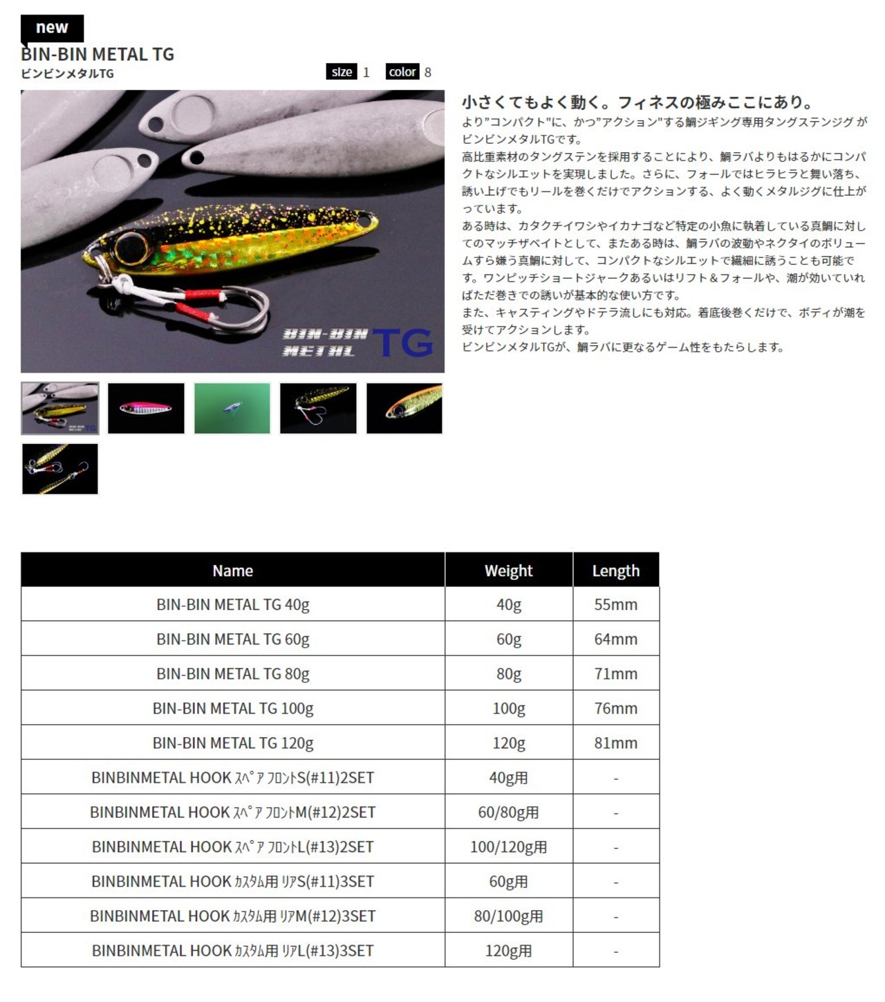 JACKALL/ジャッカルBIN-BIN METAL TG/ビンビンメタルTG◆レングス:71mm◆ウエイト:80g◆素材:タングステン小さくてもよく動く。フィネスの極みここにあり。よりコンパクトに、かつアクションする鯛ジギング専用タングステンジグ がビンビンメタルTGです。高比重素材のタングステンを採用することにより、鯛ラバよりもはるかにコンパクトなシルエットを実現しました。さらに、フォールではヒラヒラと舞い落ち、誘い上げでもリールを巻くだけでアクションする、よく動くメタルジグに仕上がっています。ある時は、カタクチイワシやイカナゴなど特定の小魚に執着している真鯛に対してのマッチザベイトとして、またある時は、鯛ラバの波動やネクタイのボリュームすら嫌う真鯛に対して、コンパクトなシルエットで繊細に誘うことも可能です。ワンピッチショートジャークあるいはリフト&フォールや、潮が効いていればただ巻きでの誘いが基本的な使い方です。また、キャスティングやドテラ流しにも対応。着底後巻くだけで、ボディが潮を受けてアクションします。ビンビンメタルTGが、鯛ラバに更なるゲーム性をもたらします。