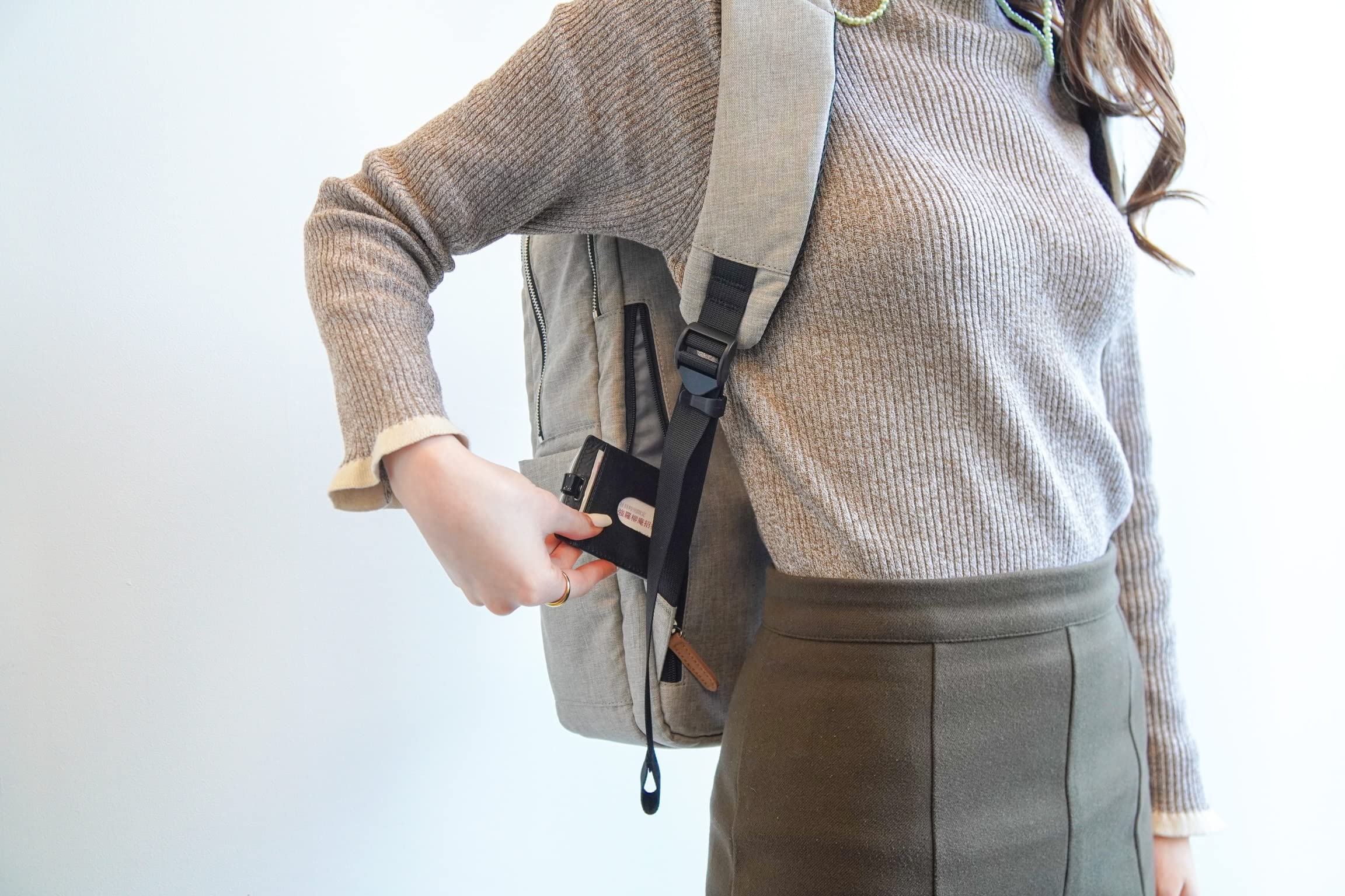 ●セキュリティ性の高い背面ファスナーポケットは、定期入れや社員証などすぐに取り出したい小物の収納に便利です。