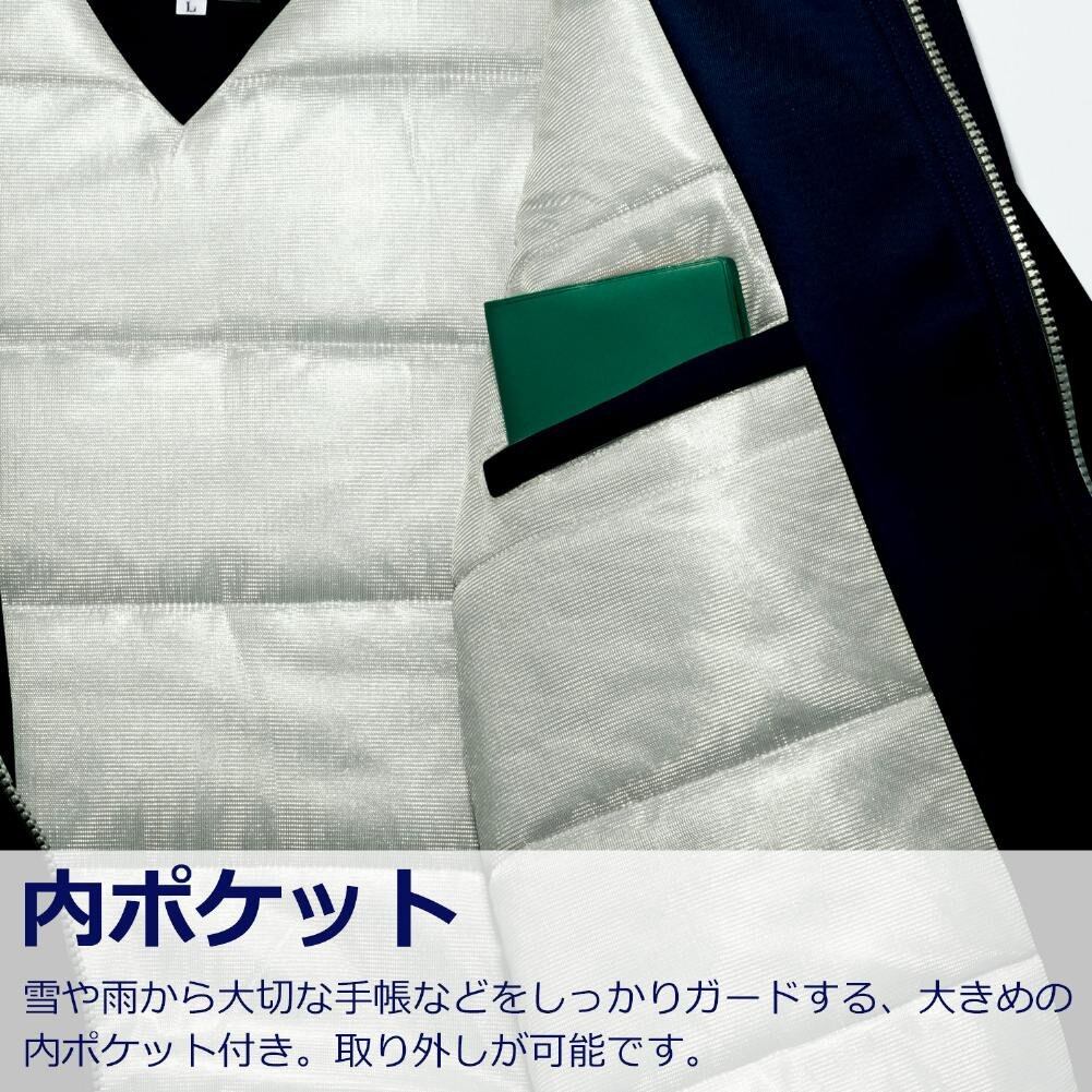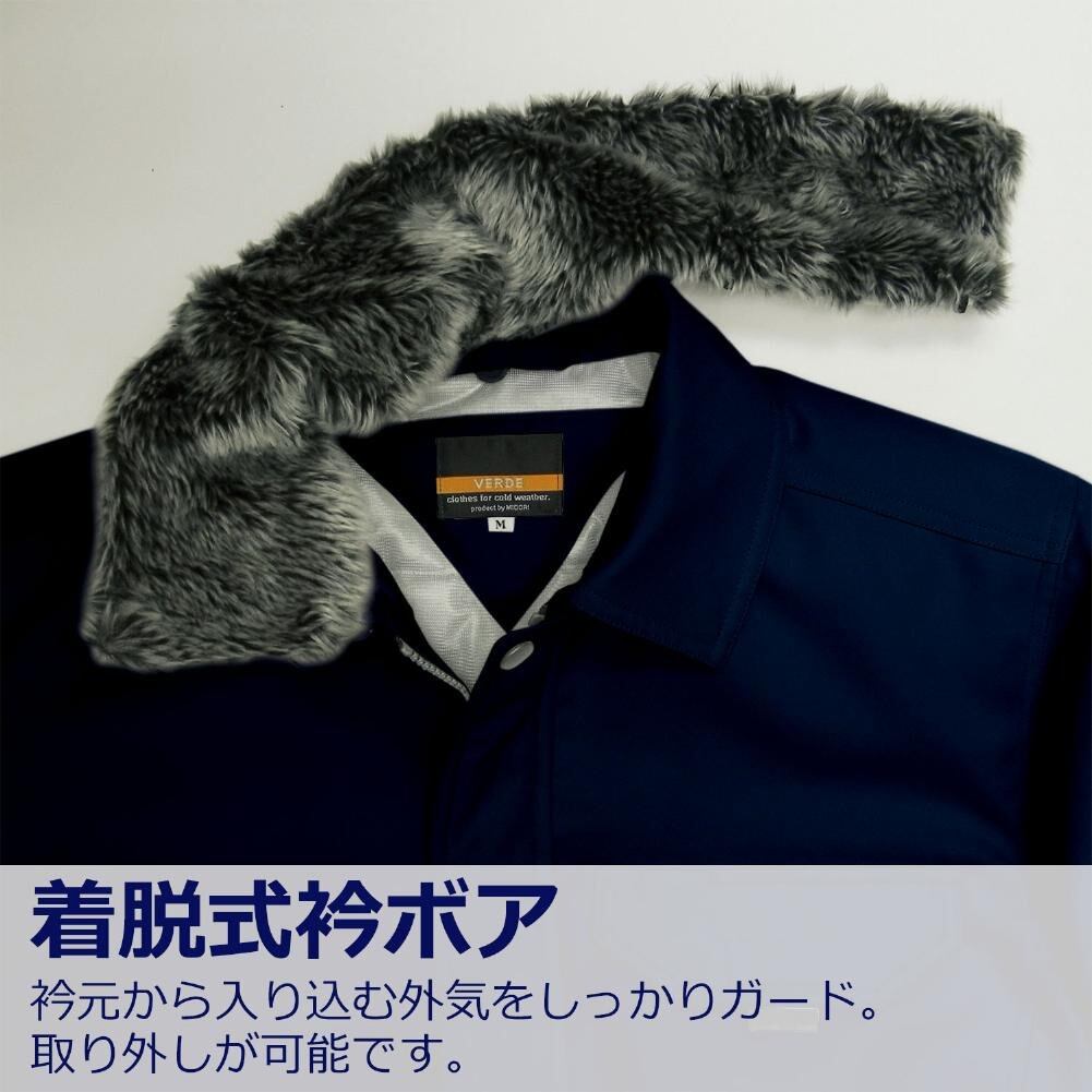 [特長] ●撥水加工 ●着脱式衿ボア ●内ポケット ●スピンドルコード ●二重袖 ●ポケット位置:左右胸ポケット、左右脇ポケット、左袖ペンポケット、左胸内ポケット