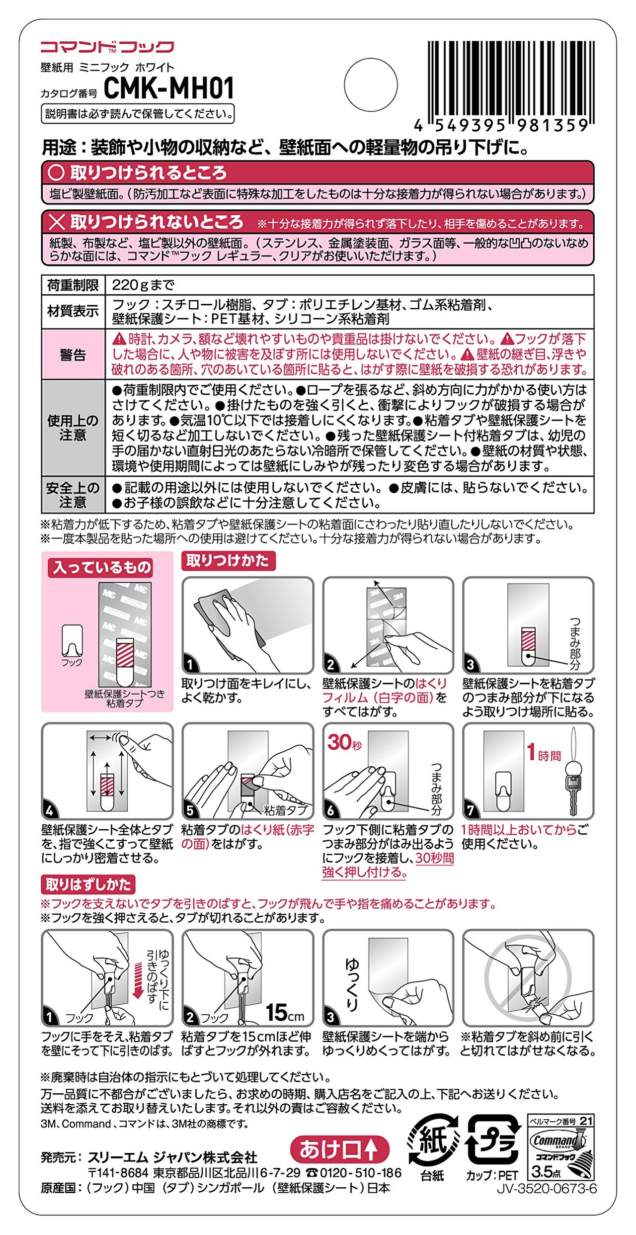 内容:フック2個、保護シートつき粘着タブS2枚