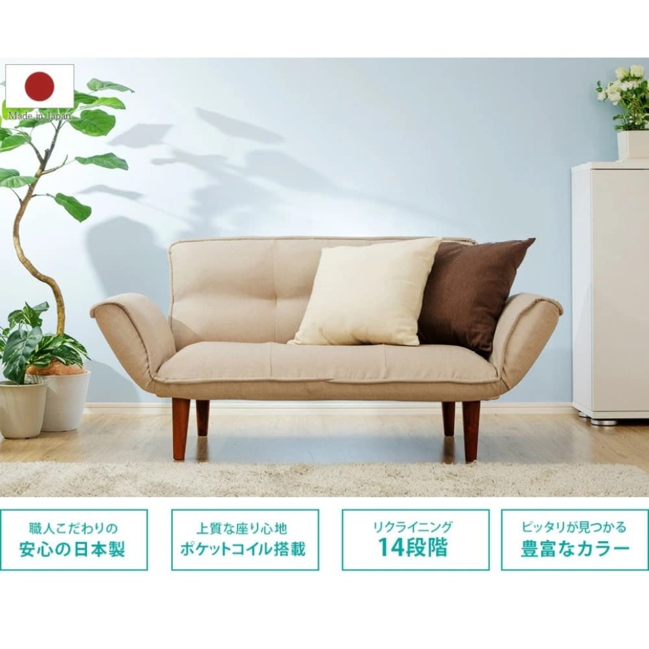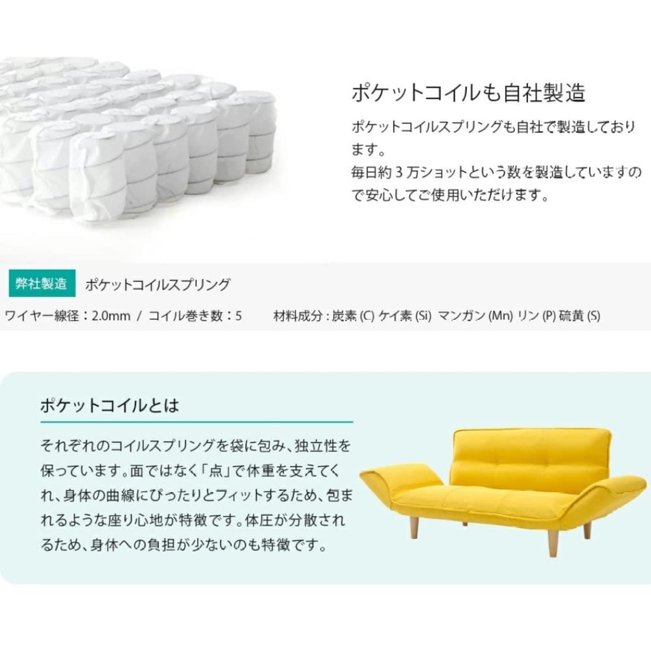 ●座面にはポケットコイルスプリングが入っていますのでクッション性抜群の座り心地です。●背もたれ、両肘は5段階リクライニング(フラット時を含む)です。●安心の日本製。【注意事項】●本商品の配送時間指定は午前・午後のみです。土日祝日は配達不可。●傷つきやすい床面はカーペット等で保護してください。●中材の取り出しはしないでください。●カバーの洗濯、取替えは出来ません。●目的外のご使用は危険ですので、おやめください●角度調整用の際は怪我をしないようご注意ください