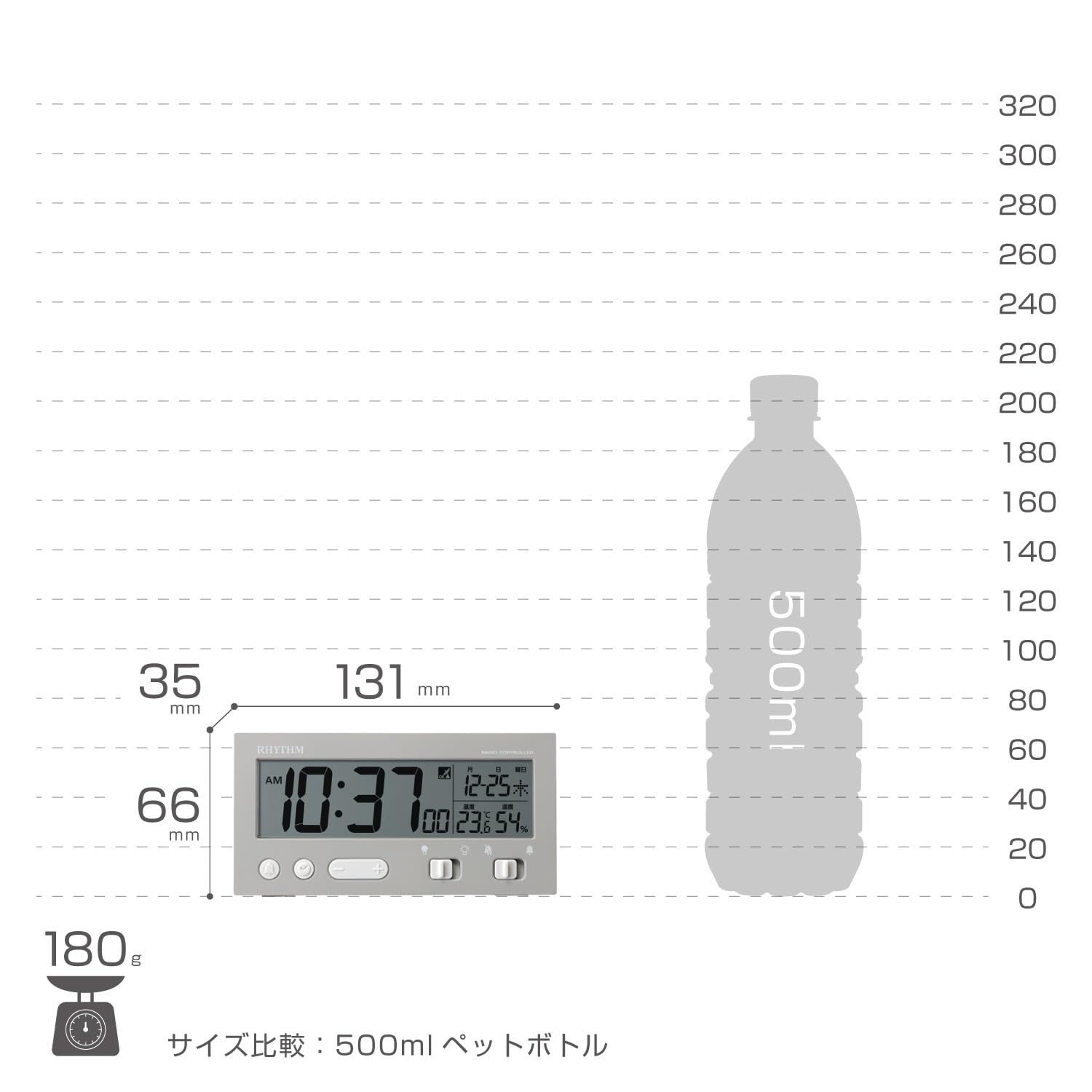 使用電源:単3形アルカリ乾電池x2本(電池別売) ムーブメント:電波時計 電子音アラーム スヌーズ機能 温度計付き(-9.9~50℃) 湿度計付き(20~99%) カレンダー表示(2099年12月31日まで表示可能) 暗所自動点灯ライト 最大数字サイズ(タテ)2.7cm