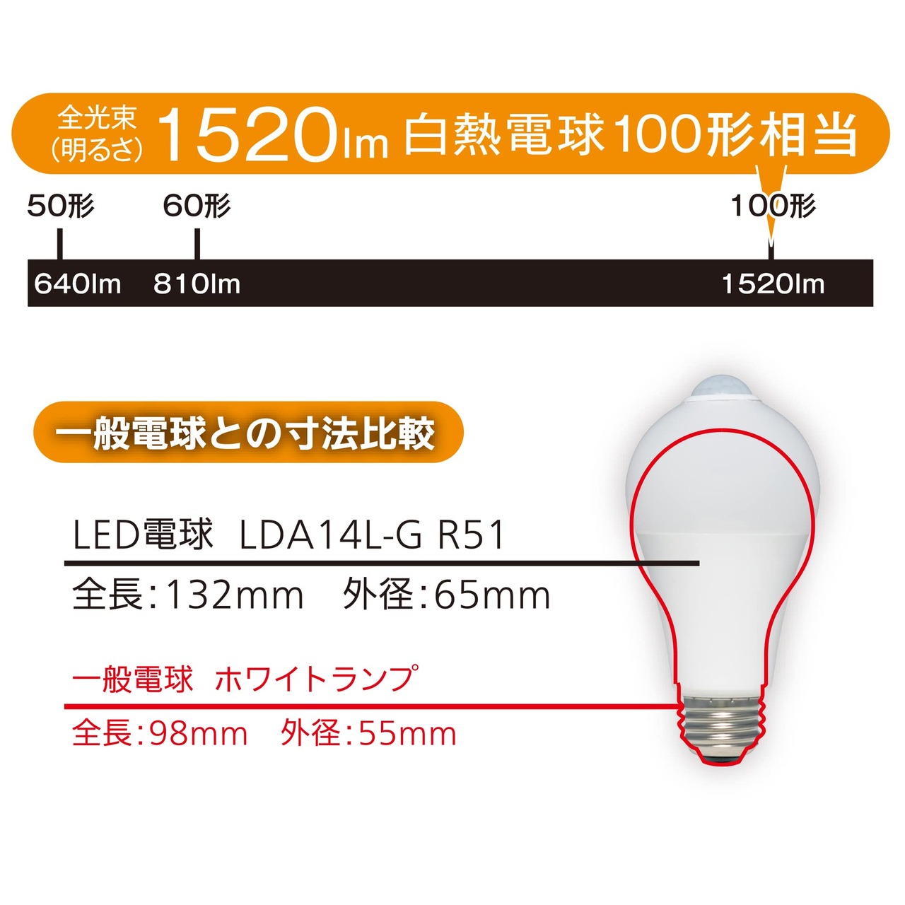 【在庫セール】オーム(OHM) 電機 LED電球 E26 100形相当 人感明暗センサー付 電球色 人感センサー 100ワット相当 自動点灯 玄関 トイレ 廊下 階段 LDA14L-G R51 06-4467