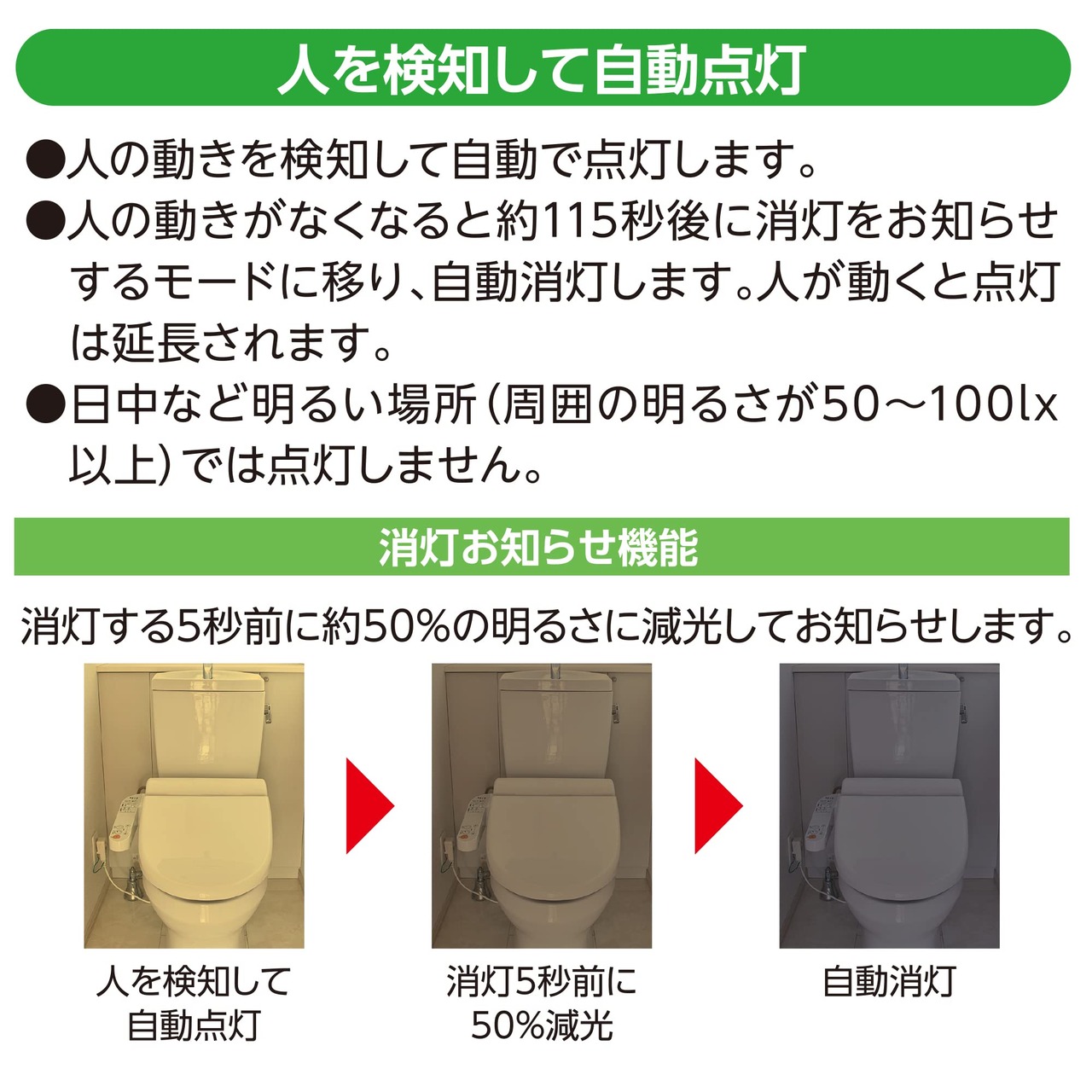 ●人の動きを検知して自動で点灯します ●人の動きがなくなると約2分後に自動消灯します ●周囲が明るい場所(50~100ルクス以上)では点灯しません ●消灯する5秒前に約50%減光してお知らせします ●白熱電球100W形相当の明るさ ●電球色 ●口金 E26