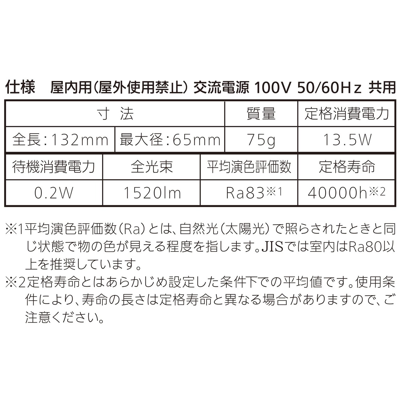 【 仕 様 】■ 寸法:全長132mm、最大径65mm■ 質量:75g■ 定格消費電力:13.5W■ 待機消費電力:0.2W■ 全光束:1520 lm■ 平均演色評価:Ra83■ 定格寿命:40000h ※屋内用(屋外使用禁止)