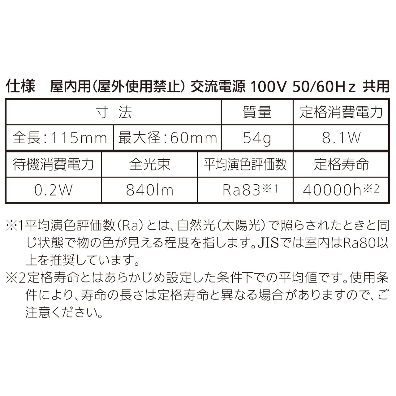 【 仕 様 】■ 寸法:全長…115mm、最大径…60mm■ 質量:54g■ 定格消費電力:8.1W■ 待機消費電力:0.2W■ 全光束:840 lm■ 平均演色評価:Ra83■ 定格寿命:40000h ※屋内用(屋外使用禁止)