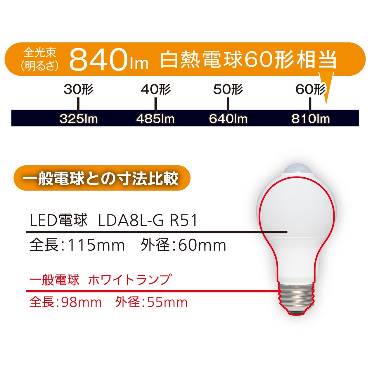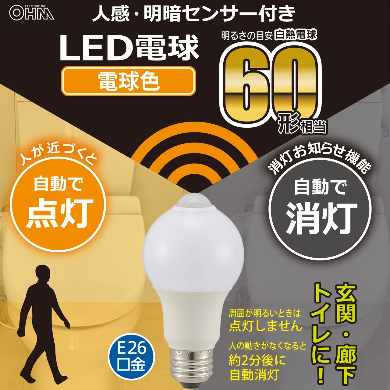 【大特価セール】オーム(OHM) 電機 LED電球 E26 60形相当 人感明暗センサー付 電球色 人感センサー 60ワット相当 自動点灯 玄関 トイレ 廊下 階段 LDA8L-G R51 06-4465