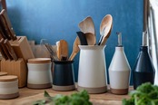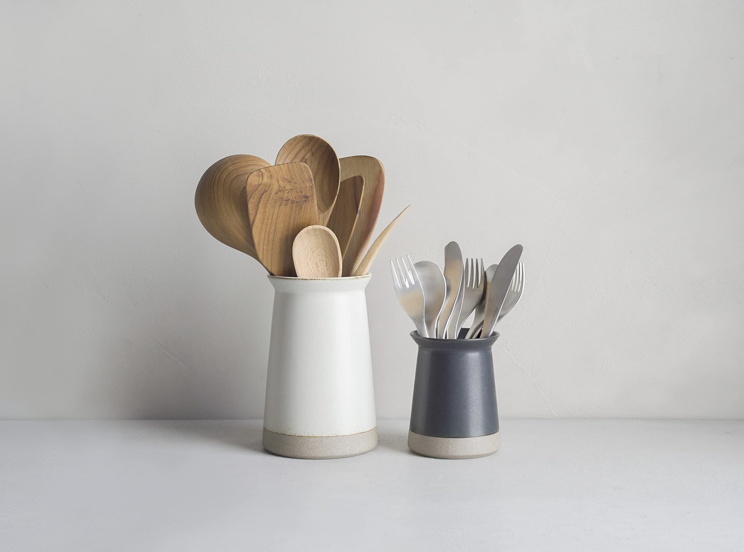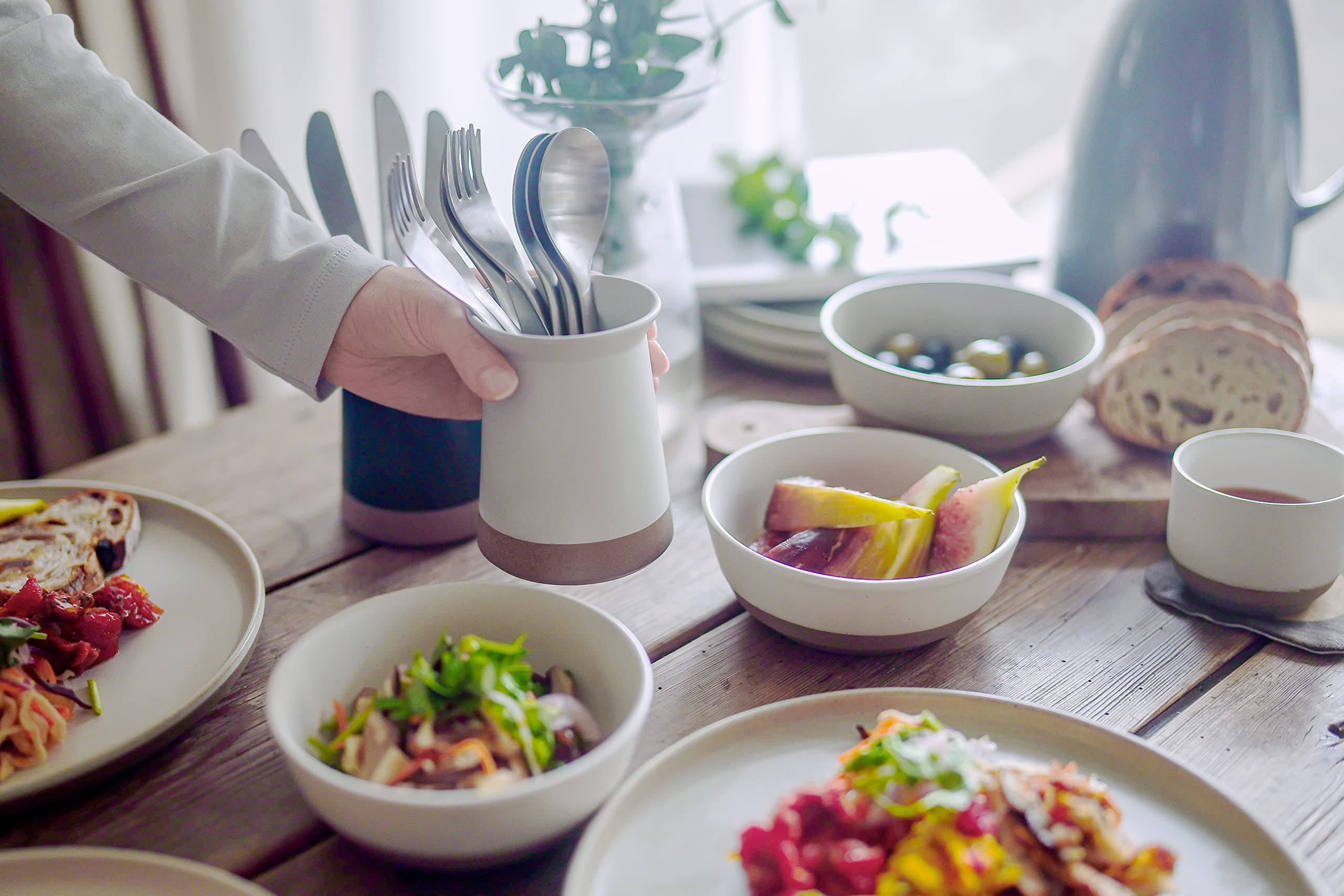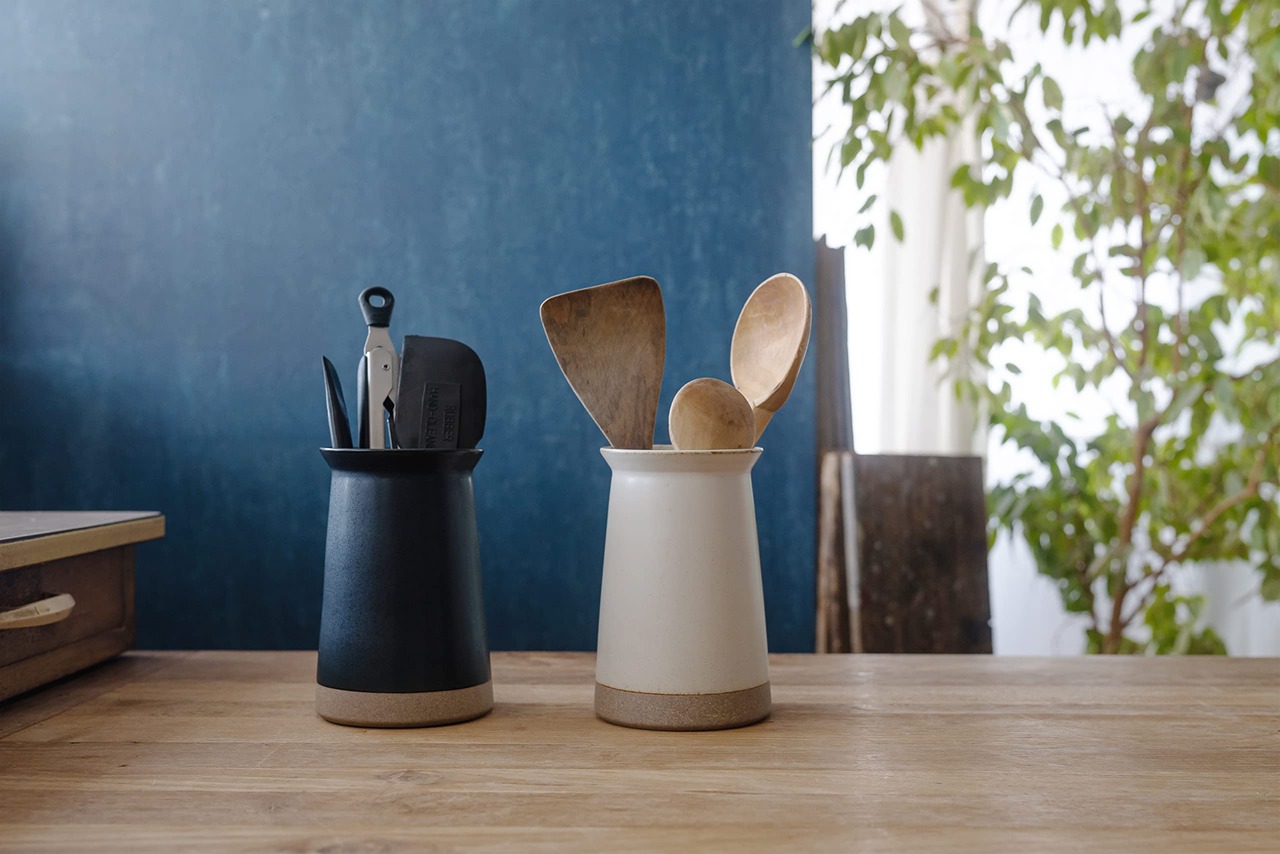 CERAMIC LABは気取らず飾らない、無骨さと繊細さが魅力。伝統を継いできた陶工と手を携え、現代の暮らしにあった「新たな日本の器」を追求しました。土や釉薬の配合、湿度や温度の変化など先人の知恵を継承しながら、幾度となく研究を重ねて見出した風合いとフォルム。素朴な土の質感や落ち着いた色合いは、生活空間に温かみを添えます。適度な重さで倒れにくい、安定感のある形状。カトラリーだけでなく、ピーラーなど柄が短いツールにも使いやすいサイズです。口元が広がっているので出し入れしやすく、カトラリーが広がりにくい設計です。くびれがあることで持ちやすく、テーブルまで安心して運ぶことができます。素朴な土の質感と味わいある釉薬で、キッチンやテーブルで映えるデザインです。