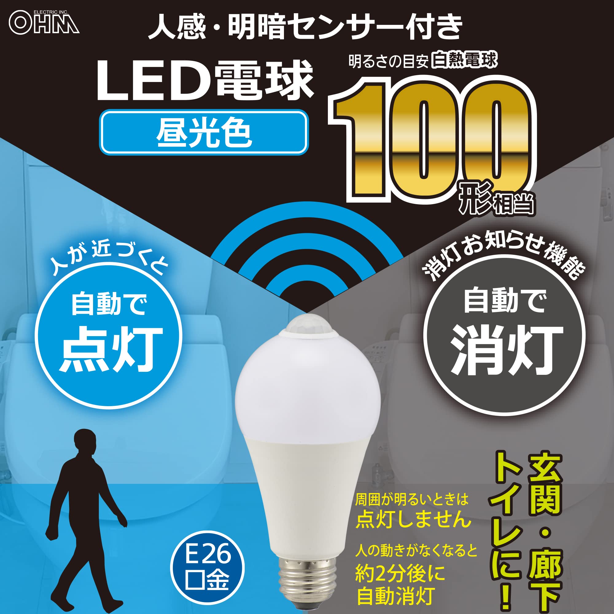 オーム(OHM) 電機 LED電球 E26 100形相当 人感明暗センサー付 昼光色 人感センサー 100ワット相当 自動点灯 玄関 トイレ 廊下 階段 LDA14D-G R51 06-4468