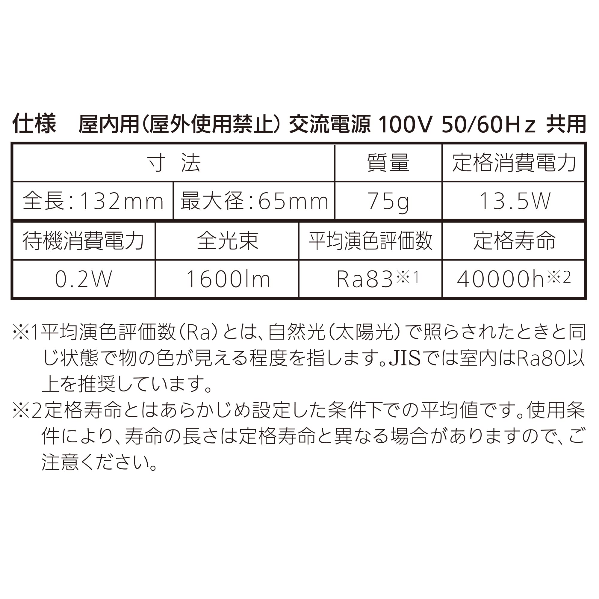 【 仕 様 】■ 寸法:全長 132mm、最大径 65mm■ 質量:75g■ 定格消費電力:13.5W■ 待機消費電力:0.2W■ 全光束:1600 lm■ 平均演色評価:Ra83■ 定格寿命:40000h ※屋内用(屋外使用禁止)
