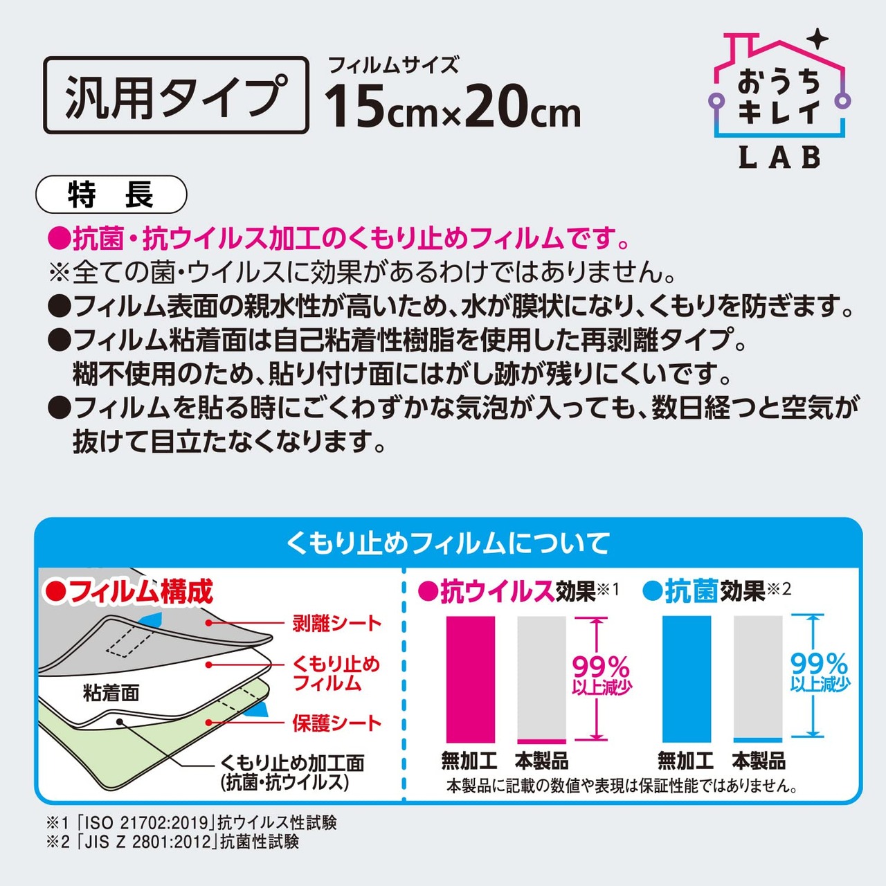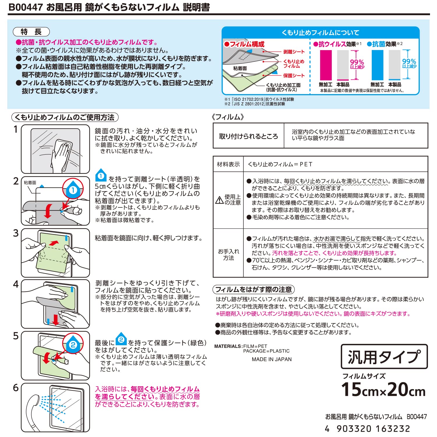 鏡がくもらない抗菌・抗ウイルス加工くもり止めフィルム!