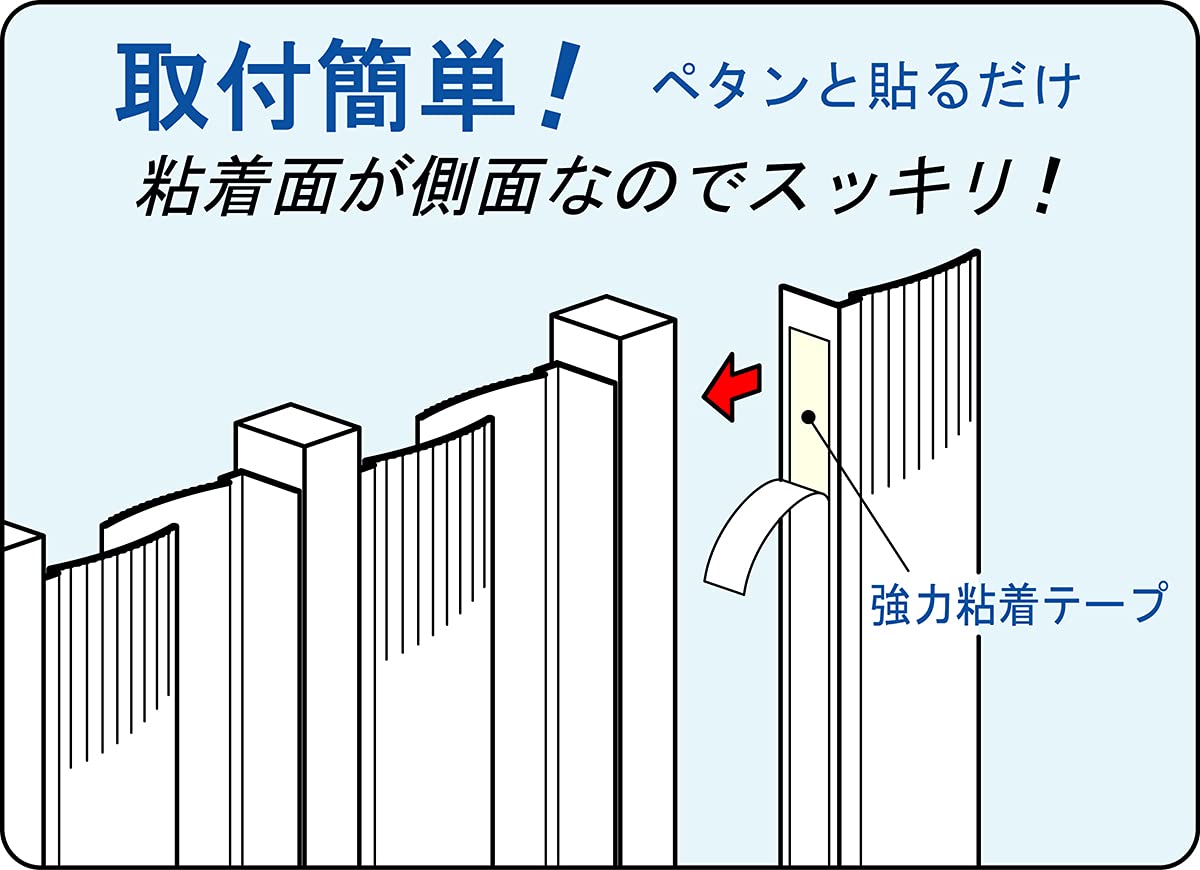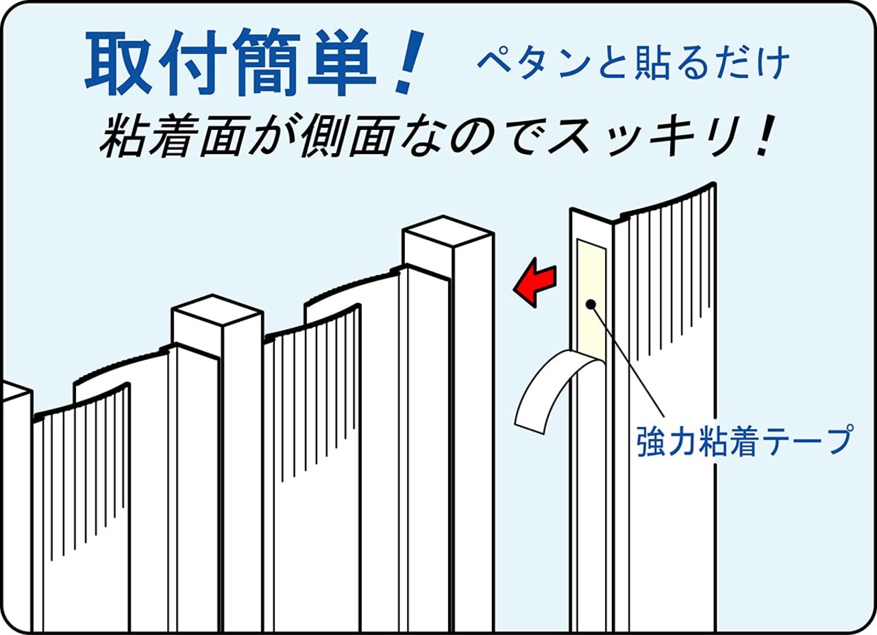 粘着面が側面のため、スッキリ。格子棒に貼るだけの簡単取付。