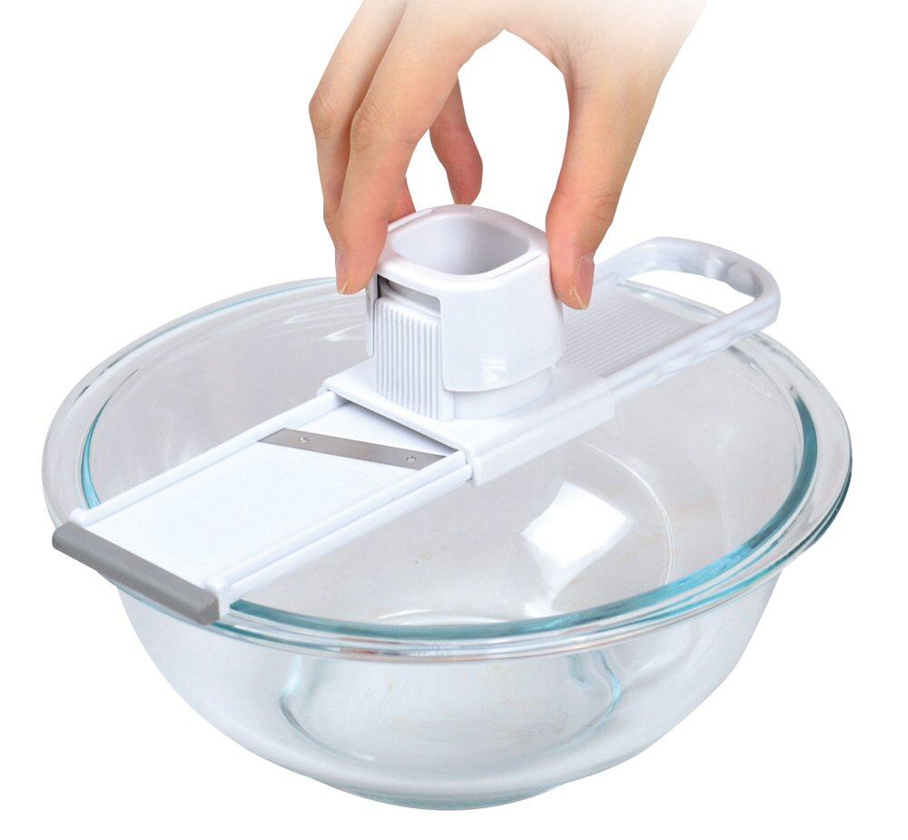 ホルダーの中にスライスするものを入れてホルダーを動かすので、指が刃に直接触れる心配がなく、安全に均一にスライスできます