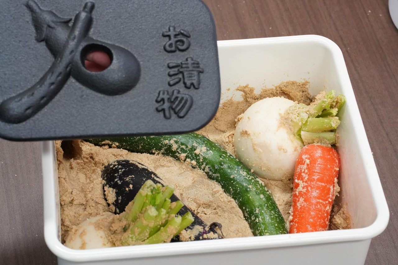 ●シール容器での浅漬けの重石に適している。取り出しやすいように指穴も開けている