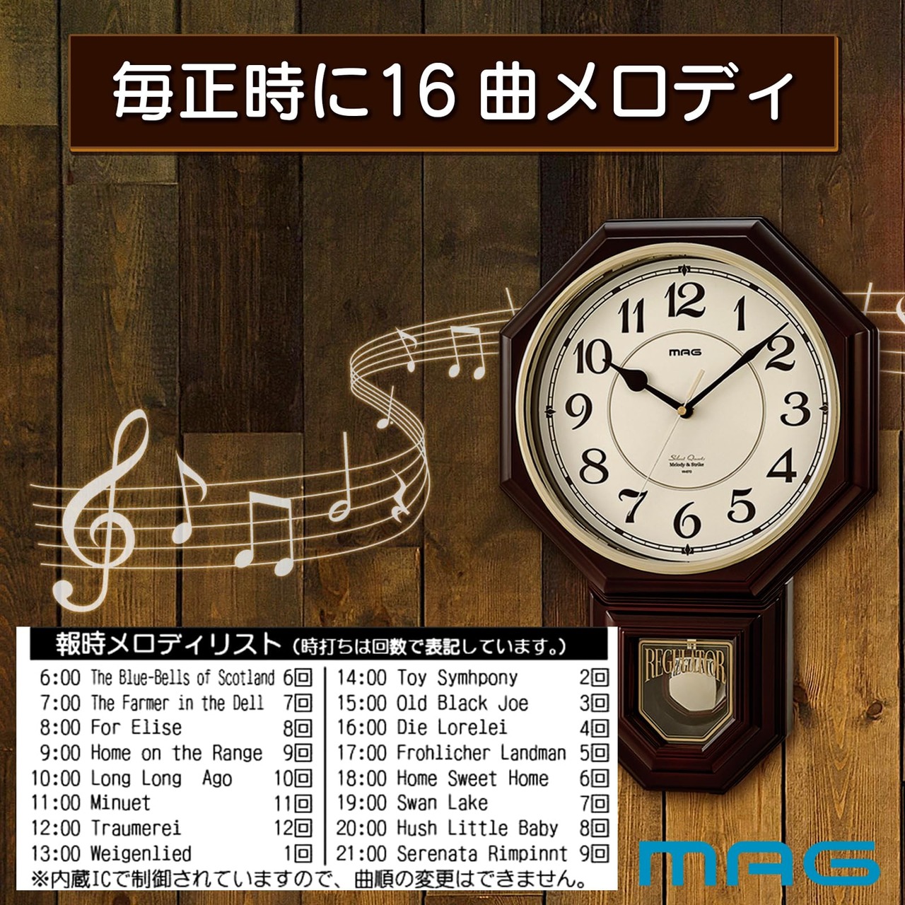 機能:連続秒針、16曲メロディ&ボンボン時打ち報時機能 (1ザ・ブルーベルズ・オブ・スコットランド、2ザ・ファーマー・イン・ザ・デル、3フォー・エリーゼ、4ホーム・オン・ザ・レンジ、5ロング・ロング・アゴー、6メヌエット、7トロイメライ、8ヴィーゲンリート、9トイ・シンフォニー、10オールド・ブラック・ジョー、11ローレライ、12メリーファーマー、13ホーム・スウィート・ホーム、14スワン・レイク、15ハッシュ・リトル・ベイビー、16セレナーデ)、報時自動鳴り止め機能 (午後10: 00~午前5: 00)、音量無段階調節 、振り子