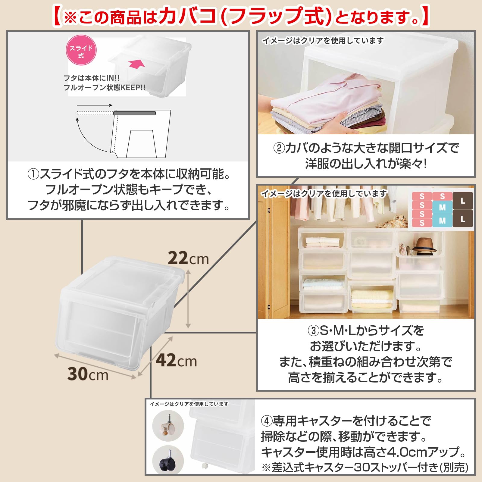 天馬(Tenma) 収納物の出し入れがしやすいフラップ式収納ボックス カバコ スリムS 完成品 場所を選ばないデザインの収納ケース フラップ扉 衣装ケース 収納しているものが把握できる半透明のクリアカラー プラスチック 【組立不要】 【色 クリア】 【サイズ スリムS】 【幅30×奥行40×高さ22cm】