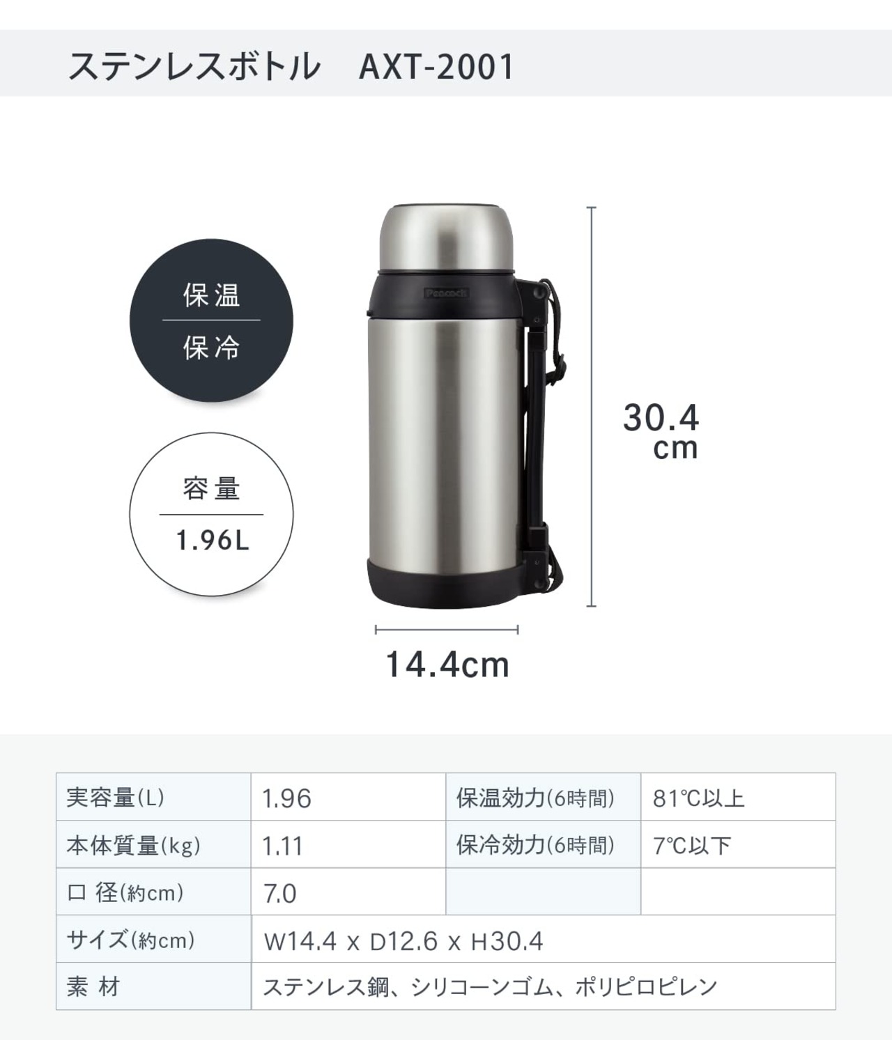 ピーコック魔法瓶工業(The-peacock) ピーコック 水筒 1.96L 保温 保冷 魔法瓶 大容量 ステンレスボトル コップ飲み 広口 ハンドル 付き ステンレス AXT-2001 XA