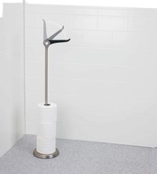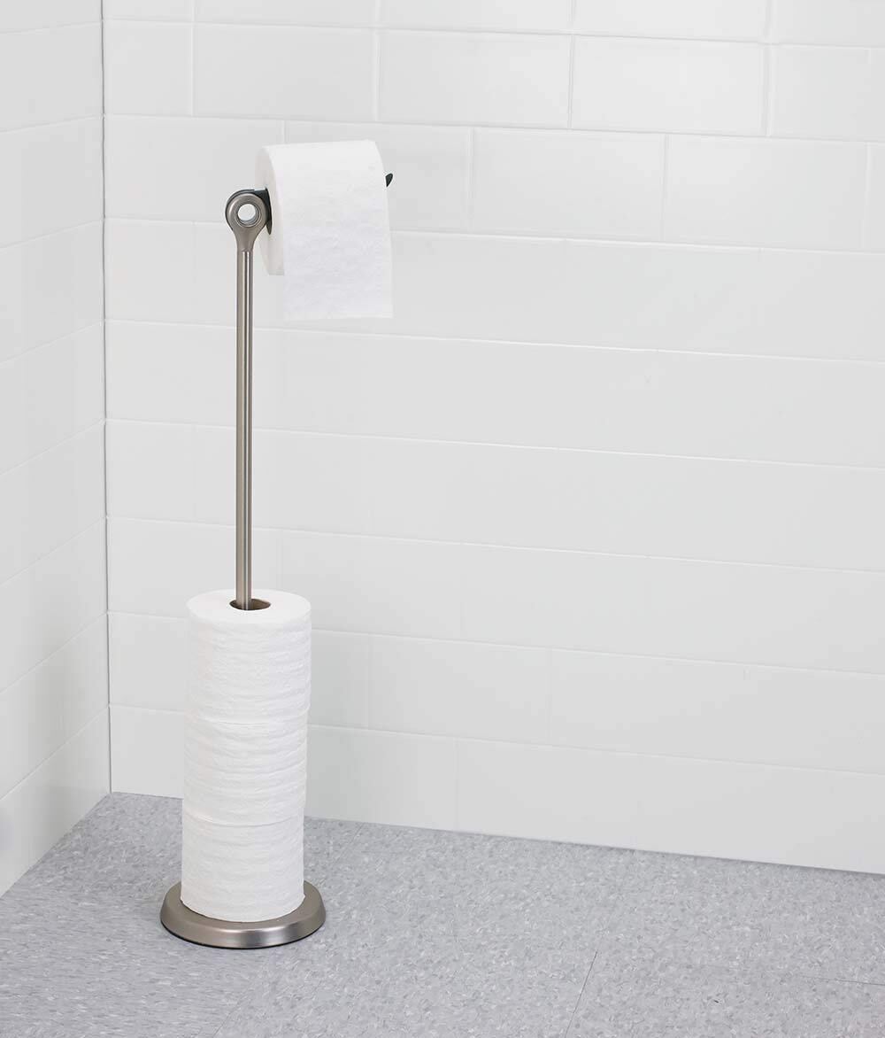 機能性とデザイン性が両立した商品で人気のumbra(アンブラ)。DESIGN:HELEN T. MILLER。スタンド式のトイレットペーパースタンド。お好きな場所に立てて使える。トイレットペーパーストッカーの機能もあり、先端のバーを真っ直ぐにすると収納できる。最大6ロールまでストックできる