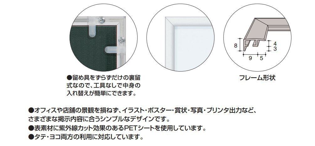 イラスト、ポスター、賞状、写真、プリンタ出力、各種許認可証など、さまざまな掲示内容に合うシンプルなデザインです。