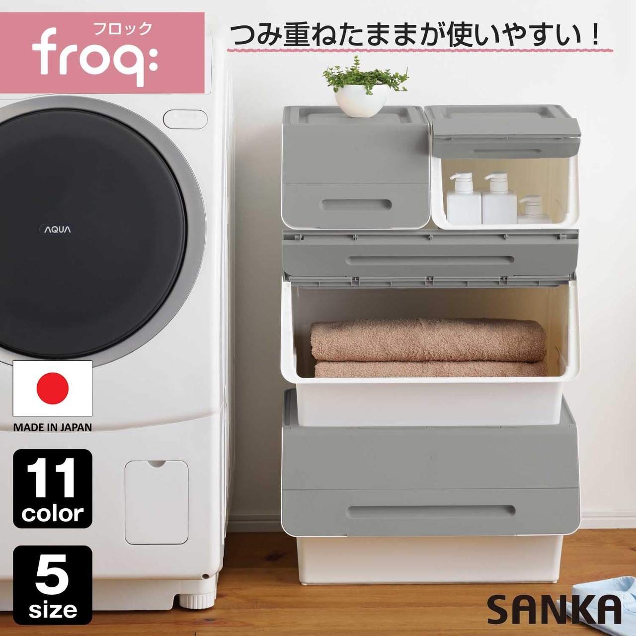 サンカ フロック 重ねて使える蓋付き衣装ケース サンド グレー おしゃれな大容量収納 引き出さずに使える前面開閉式 カパっとひらく固定できるフタ キャスター取り付け可能 日本製 衣類 収納ボックス (幅38.5×奥行46×高さ31cm) froq fr-30GY/WH