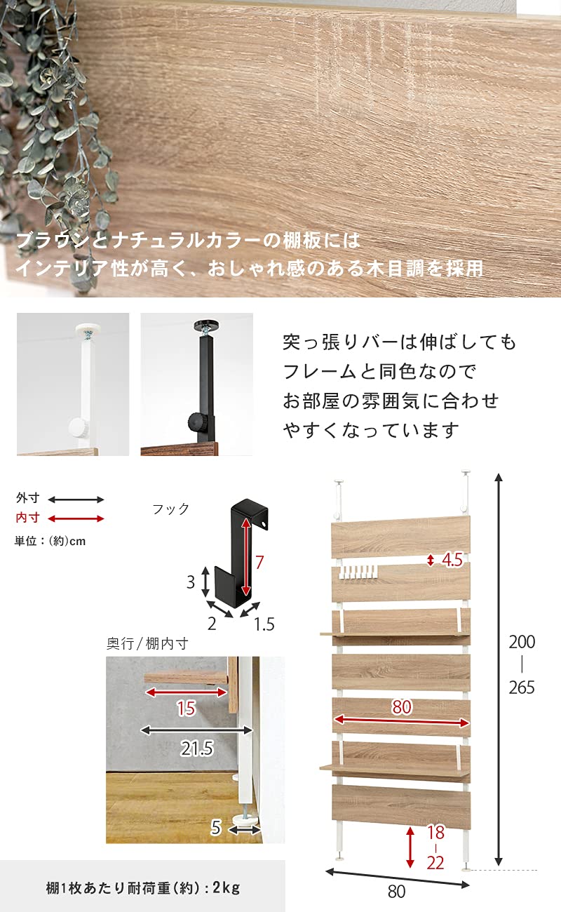 【本体サイズ】:(約)幅80×奥行21.5×高さ200~265cm