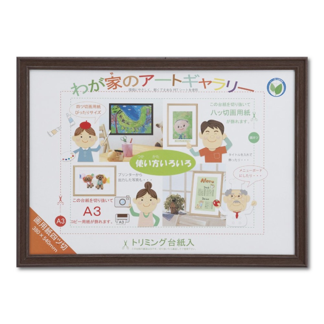 画用紙の四つ切りが入る大きさの額で、お子様の作品を飾るのに最適。